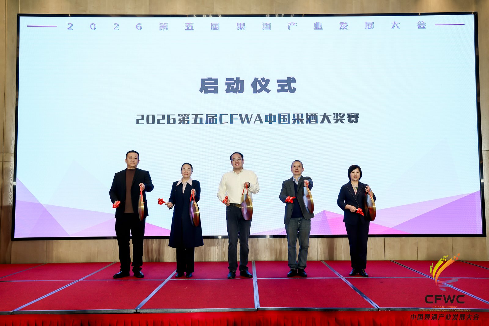 CFWA中国果酒大奖赛组委会主席周劲松、评委会主席林红,与CFWA中国果酒大奖赛评委代表、四川轻化工大学食品与酿酒工程学院教授、中国酒业协会果酒技术委员会委员边名鸿,CFWA中国果酒大奖赛评委代表、意大利英纳帝斯中国区首席代表,国家一级酿酒师、一级品酒师葛毅轩,以及今年大奖赛承办单位代表、新疆库尔勒市罗菲特果业科技有限公司总经理罗厦,以鸣锣的方式开启了2026第五届CFWA中国果酒大奖赛,宣告从3月26日起到6月底止,大奖赛正式接受申报报名,7月中旬在新疆库尔勒市举行评审大会。