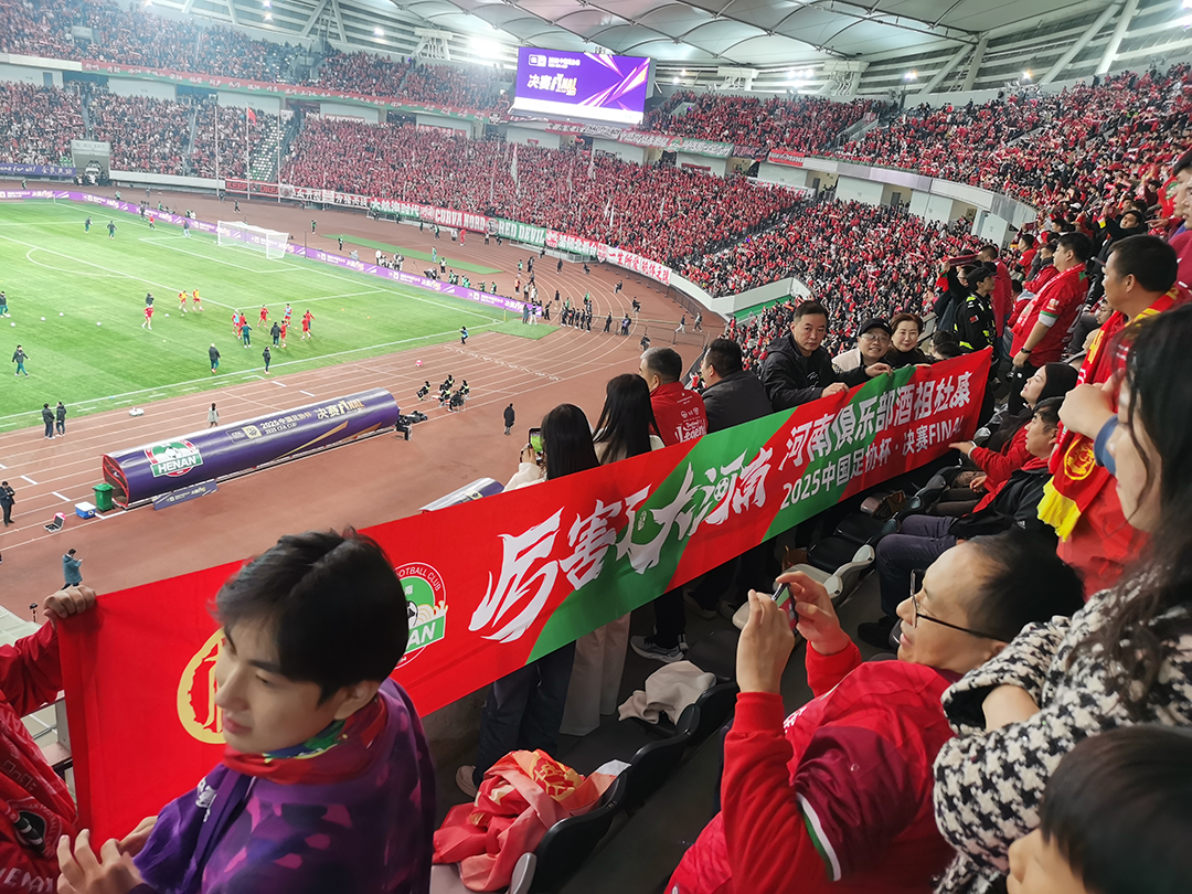 两万余名河南球迷身着红色战袍汇聚于此,将客场化作主场,助威声不断,见证河南俱乐部酒祖杜康队的足协杯的决赛首秀。