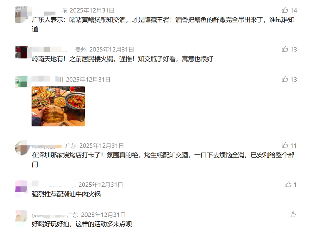 线下消费热度同样高涨。在广州、深圳、佛山、东莞等热门城市,知交酒已成为老友叙旧、家人小聚等场景的新标配,以醇和酱香稳占青年人的餐桌C位,被称为“气氛担当”。