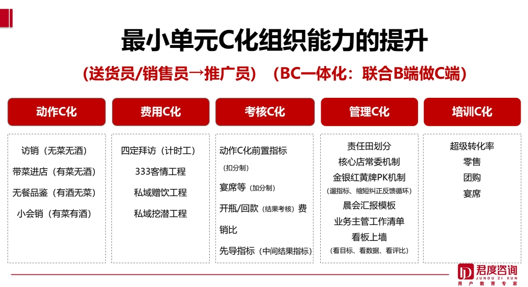 近期君度服务的一家30亿规模省酒企业大区老总对项目组说,“我以前不认可用户教育和C化打法,动作太复杂了,但是今年不一样了,终端对压货不接招了,只能按照C化操作来了!”