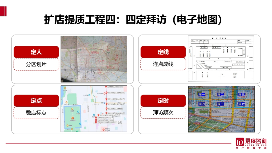 区域精耕:划分业务“责任田”,实现网格化覆盖;通过“数店标点、连点成线”构建终端地图,并执行分频次拜访(如核心店每周2次)。