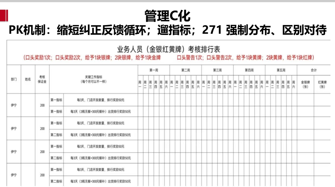 “遛指标”:每日/每周关键数据(如C化动作完成率、宴席订单数)透明化滚动播报,形成压力传递与动力激发。