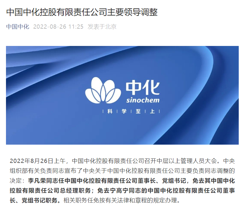 8月26日上午11点25分,中国中化官微推文,免去宁高宁同志中国中化控股有限责任公司董事长、党组书记职务,李凡荣接任。