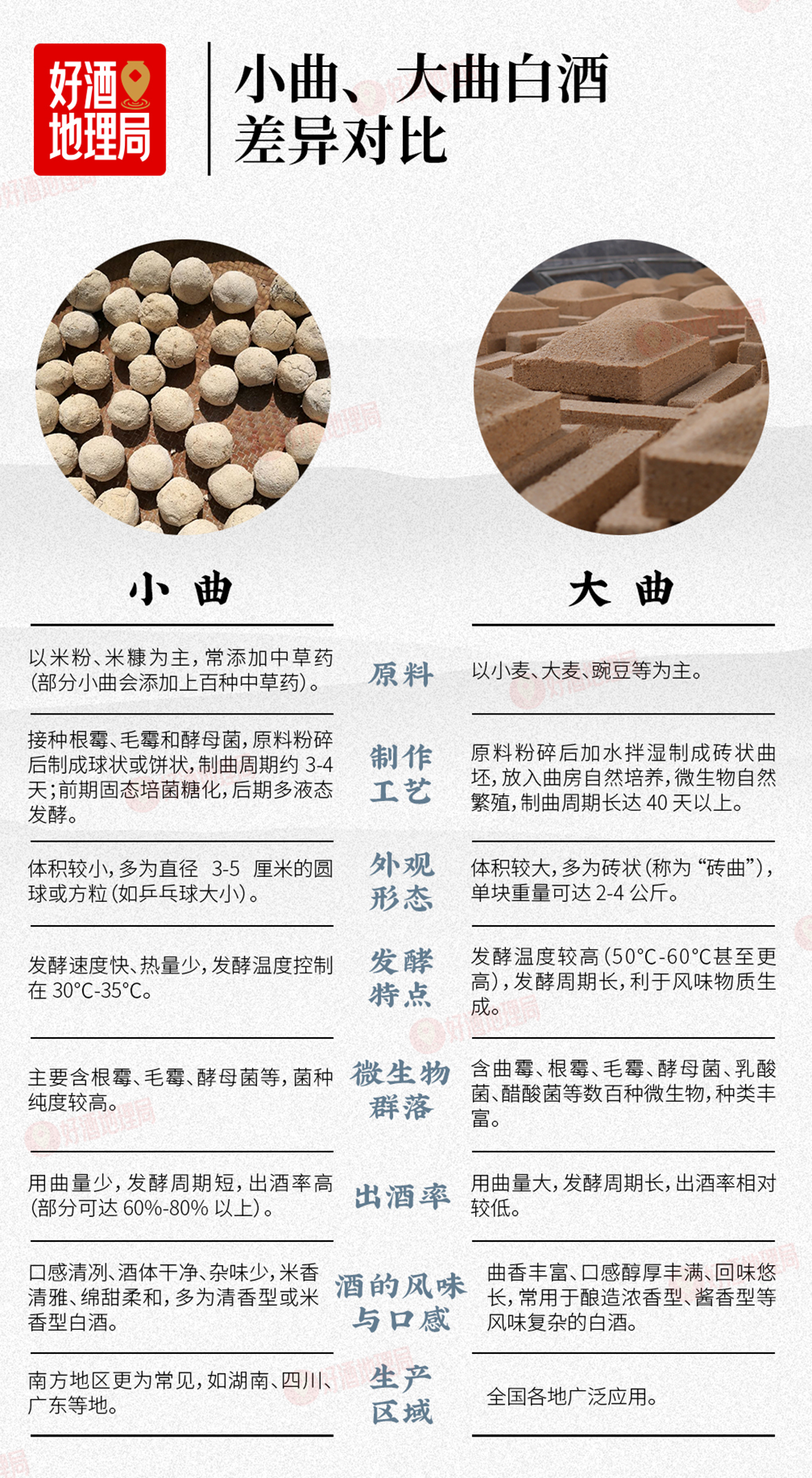 在工艺特点、微生物群落、酒体口感等诸多层面,大曲、小曲之间同样有着显著差别。有关小曲酒与大曲酒的高下之分,也一直流传于诸多白酒“老饕”之中。
