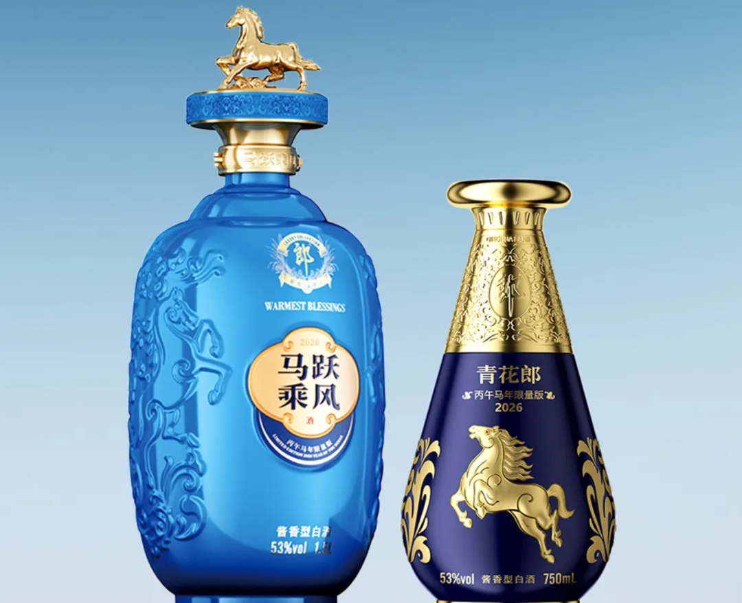 11月21日,郎酒丙午马年生肖纪念酒“马跃乘风(丙午马年限量版)、青花郎(丙午马年限量版)”上市。马跃乘风酒精度53%vol,1.5L/瓶建议收藏价8999元/瓶,产品以新锐蓝色为主色调,寓意奋进通达、前程万里,是郎酒高端奢香藏品系列的小批量勾调、限量典藏之作。青花郎(丙午马年限量版)酒精度53%vol,750ml/瓶建议收藏价2999元/瓶,产品取“金马玉堂”吉意,将汗血宝马踏云衔芝的祥瑞典故转化为流动的金色光韵,既彰显“一马当先铸大业”的进取精神,亦传递“金鞍焕彩入玉堂”的美好祝愿。(郎酒股份)
