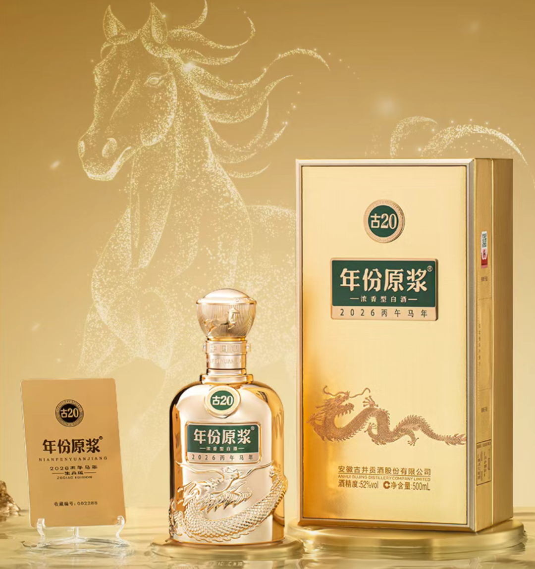 12月12日,2026年丙午马年生肖版年份原浆古20新品上市。该产品酒精度52%vol,500ml/瓶,采用一瓶一证一编号,首发价600元/瓶。(古井俱乐部)