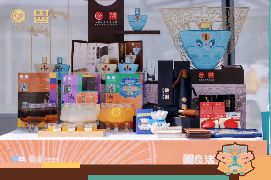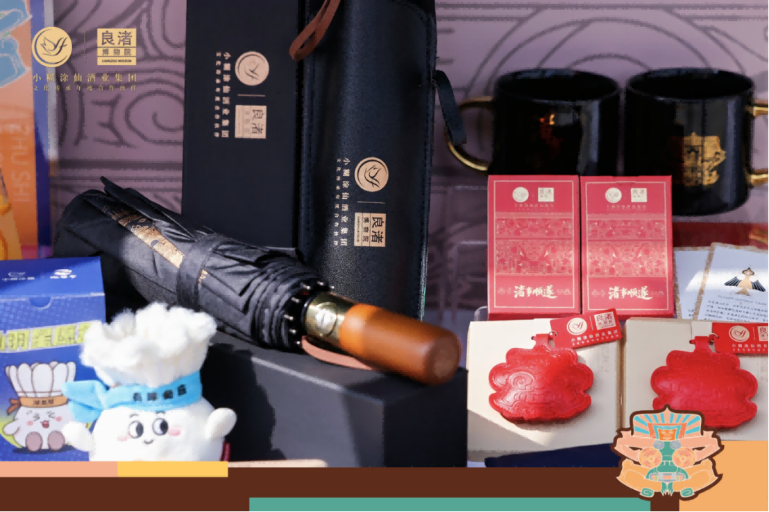 户外的互动式文创市集更注重大众参与感,小糊涂仙在陈列联名酒品的同时,还集中呈现了丰富的联名文化周边。这些周边产品兼具实用性与文化辨识度,让良渚文化元素以更轻盈的方式走进日常生活,也将小糊涂仙的品牌温度传递给大众。
