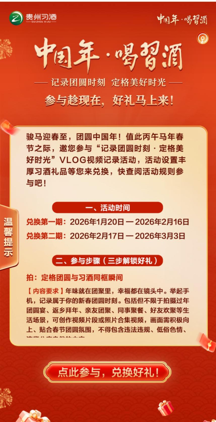 线上温情联动,线下浸润人心,构成2026“中国年·喝习酒”活动的鲜明特色。贵州习酒精准把握国人记录团圆时刻、传递温情的情感需求,将线上Vlog共创活动打造为年度核心实践。在春节期间,贵州习酒诚邀广大网友创作新春短视频,自1月20日活动启幕,持续至3月3日,覆盖整个春节假期,不论是年夜饭桌上与家人的围坐,亦或返乡路上一句亲切的乡音,再或走亲访友时互道新春吉祥,只要在画面中有机融入任意一款或多款习酒产品,在视频号端口发布,带上话题#中国年·喝习酒 即可参与赢礼赠,也为鼓励参与本次活动的网友,贵州习酒筹备万瓶产品作为礼品(参与者通过君品荟微信小程序即可查看相应规则和兑换相应礼品)。