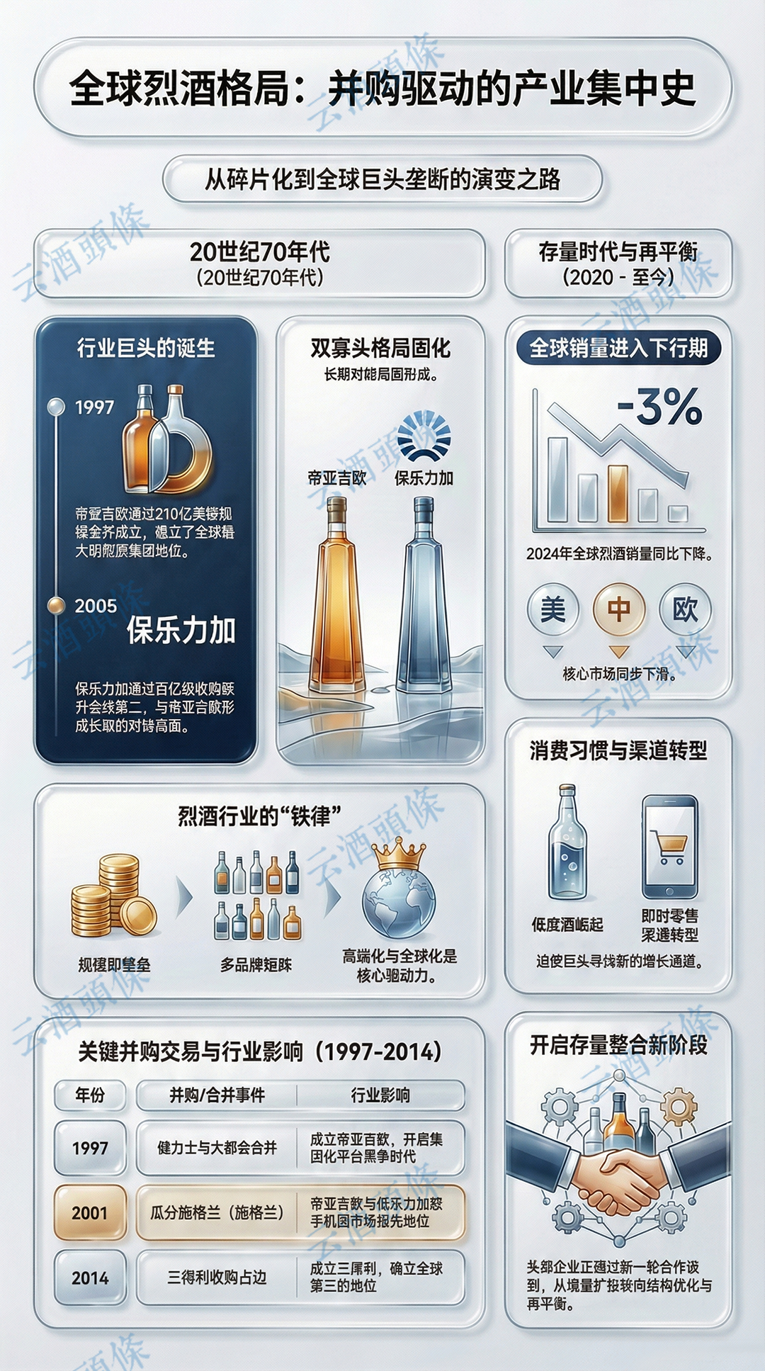 文|石磊 法国烈酒巨头保乐力加,与美国最大的烈酒集团百富门,正在酝酿一场“跨国”整合。3月26日,双方同步发布公告,确认正就对等合并事项开展磋商。 这一动向,被视为2005年保乐力加收购联合多美(Allied Domecq)以来,全球烈酒行业最具格局意义的重组尝试。若交易达成,一个市值接近300亿美元、年营收超150亿美元的新巨头将诞生,全球烈酒“双寡头”格局将面临新的挑战。 回望上世纪以来的全球烈酒行业发展,历经三轮重要的并购整合浪潮,从分散走向集中、从区域走向全球,最终形成帝亚吉欧、保乐力加领衔的稳定格局。此次法美两大巨头抱团,既是行业增长放缓、周期压力加剧下的战略选择,也是全球烈酒进入存量竞争时代的标志性事件。 同时,全球烈酒百年整合脉络,也为白酒的规模化、集中化、现代化转型,提供了重要参照 压力驱动的强强联合 将保乐力加与百富门的整合,置于全球酒业下行、增长承压、增长加剧的宏观背景下,就会发现,这并非短期资本操作,而是双方必然选择,两大巨头在品牌、区域、渠道等方面高度互补,合并后有望快速补齐短板,直面帝亚吉欧的规模优势。 保乐力加是全球第二大烈酒集团,1975年由保乐(Pernod)与力加(Ricard)合并成立,通过持续并购,构建起覆盖多品类的全球化品牌矩阵。 目前,保乐力加业务覆盖全球160余个国家和地区,直营网络遍及30多个核心市场。旗下拥有马爹利(Martell)、绝对伏特加(Absolut Vodka)、芝华士(Chivas Regal)、格兰威特(The Glenlivet)、尊美醇(Jameson)等全球核心品牌。 但同时,保乐力加的市场结构性短板明显:在全球第一大烈酒市场美国,其份额仅为8%左右,远低于帝亚吉欧的15%与百富门的20%,且缺乏美国威士忌强势品牌,终端掌控力不足。 2025财年,保乐力加实现净销售额109.59亿欧元,有机销售额同比下滑3%;净利润16.26亿欧元,同比增长10%,利润增长主要来自资产处置与重组,而其主业增长乏力。 进入2026上半财年,保乐力加实现净销售额52.53亿欧元,同比有机下滑5.9%,实现经常性营业利润16.14亿欧元,同比有机下滑7.5%。保乐力加将2026年度,定位为“过渡年”,欧洲市场销售疲软、美国市场份额偏低、中国高端品类承压,成为业绩持续走低的主要原因。 百富门(Brown Forman)成立于1870年,由创始者布朗家族控股并掌握67%投票权,是美国规模最大的烈酒企业。截至2026年3月,公司市值约125亿美元。2025财年,百富门实现净销售额39.75亿美元,同比下滑4.9%;净利润8.69亿美元,同比下滑15.1%。2026财年上半年,百富门业绩继续下滑,核心大单品杰克丹尼(Jack Daniel’s)增长见顶,龙舌兰品类下滑幅度达12%—23%。 百富门的市场布局方面,以美国威士忌与高端龙舌兰为双支柱,杰克丹尼(Jack Daniel’s)是全球销量最高的美国威士忌,为公司贡献超六成收入;伍德福德珍藏(Woodford Reserve)是超高端波本威士忌的标杆品牌;赫拉杜拉(Herradura)、埃尔吉马多(el Jimador)则分别布局高端与大众龙舌兰。美国本土市场为百富门贡献约43%营收,墨西哥为其第二大市场,并在巴西、日本等市场表现强势,直营覆盖16个国家。 但整体来看,百富门的全球化程度不足,欧洲、亚太依赖第三方分销,品牌结构集中,抗风险能力较弱。 通过上述分析不难看出,保乐力加与百富门的整合,具有清晰的互补逻辑,保乐力加输出全球渠道、全品类运营与跨国管理能力;百富门补齐美国威士忌与北美、拉美终端优势。仅从现有数据来看,合并后,新集团全球烈酒市场份额将从12%提升至18%,与帝亚吉欧约22%的份额差距显著收窄。 当然,二者的整合进程仍面临着多重不确定性,包括百富门方面布朗家族对控制权的诉求、欧美反垄断审查、渠道重合带来的整合成本、跨文化管理难度等等,都可能影响交易落地与后续效果。在全球市场压力驱动下的“强强联合”效应,有待时间和市场的实际检验。 一部并购驱动的产业集中史 当前,全球烈酒市场呈现头部集中、双寡头引领、梯队化竞争的格局,这并非自然形成,而是一部由资本与战略并购主导的集中化历史。理解这一进程,才能看懂保乐力加、百富门整合的深层次意义。 早期分散阶段:区域割据,产业高度碎片化 20世纪70年代以前,全球烈酒市场高度分散,以国家和区域为边界独立运行。包括苏格兰威士忌、法国干邑、美国波本、日本威士忌等诸多品类,多以本土或周边贸易为核心市场,企业规模小、品牌分散,跨区域运营能力极弱。 这一阶段的特点,是有经典品类、无全球巨头,有地域特产、无跨国体系,行业停留在单一品牌、单一区域、单一品类的竞争模式。 第一轮现代整合:1970年代—1990年代,巨头雏形确立 进入上世纪70、80年代,随着全球贸易自由化、旅游零售渠道(机场、口岸、市内免税店等)兴起、跨国消费普及,推动烈酒行业进入第一轮现代化整合。行业共识逐渐形成:单一品牌难以抵御周期,多品牌、多品类、跨区域的集团化平台,成为全球烈酒增长的必由之路。 变化最初出现于法国,1975年,保乐与力加,作为法国茴香酒市场上的一对“老对手”,于1975年宣布整合联手,从此开启雄心勃勃的国际市场整合。保乐力加于1988年收购尊美醇,1993年增持马爹利股份,逐渐从一个法国区域性酒企,成长为全球市场参与者。 而本轮最具里程碑意义的事件,无疑是1997年帝亚吉欧(Diageo)成立,当时由英国健力士(Guinness)与大都会(Grand Metropolitan)以210亿英镑规模换股合并,