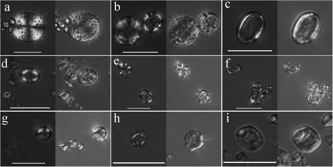 ▎双槐树遗址陶杯表面提取到的酿酒损伤淀粉粒。图源@参考文献4