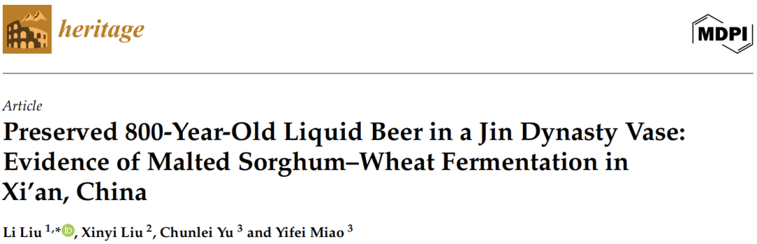 [5]LIU L, LIU X Y, YU C L, et al. Preserved 800-Year-Old Liquid Beer in a Jin Dynasty Vase: Evidence of Malted Sorghum–Wheat Fermentation in Xi’an, China[J]. Heritage, 2025, 8: 426.