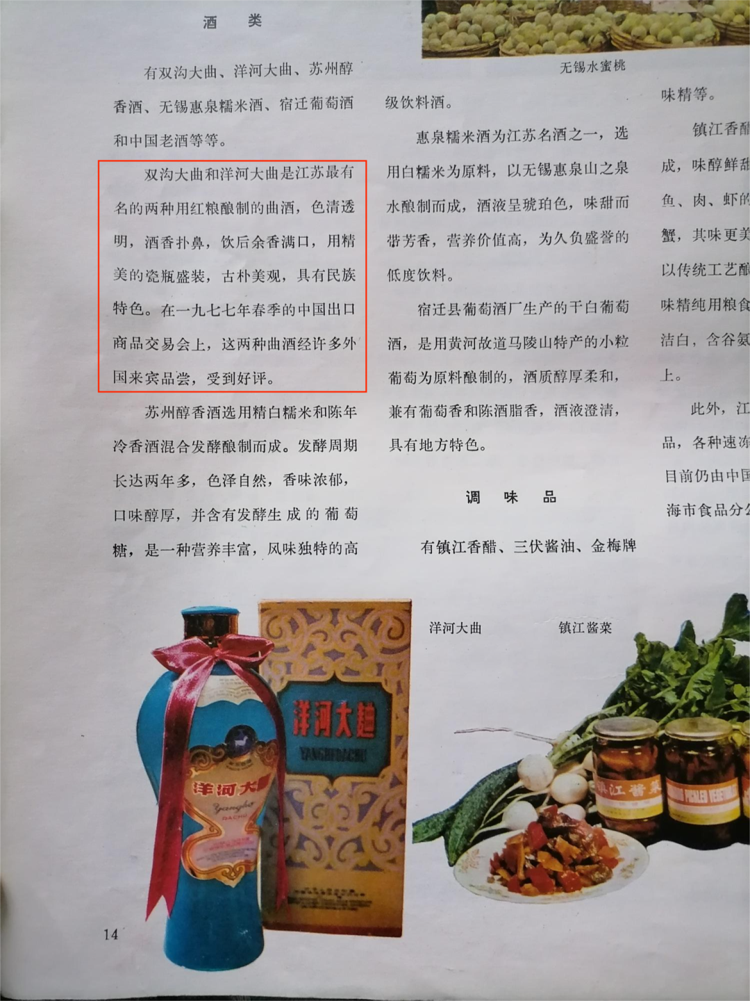 江苏的洋河大曲,其典雅古朴的瓷瓶包装被选入《中国对外贸易》一书。书中这样描述它:“色清透明、酒香扑鼻、饮后余香满口……”