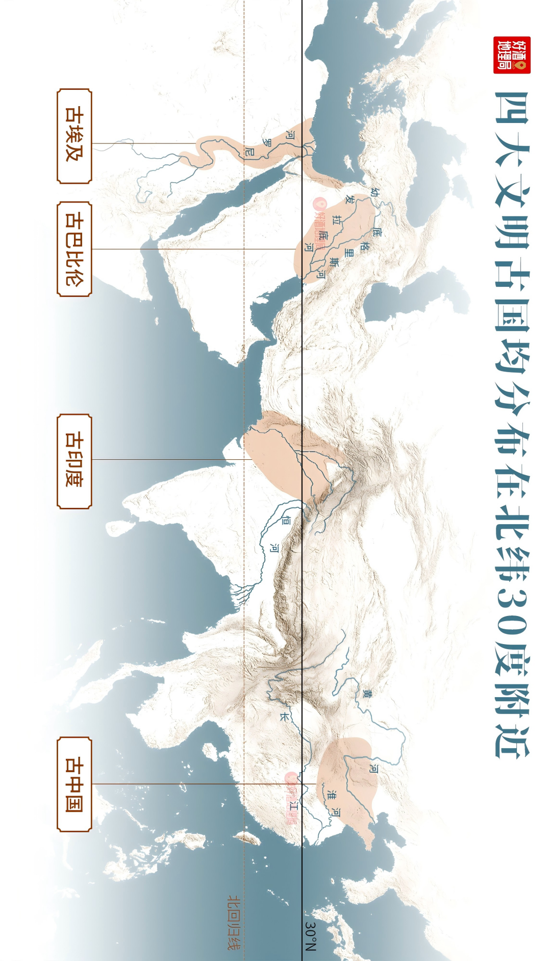 事实也确实如此。世界四大文明古国——古埃及、古巴比伦、古印度和中国,都诞生在北纬30度线附近。因此,这一纬线也被称为“人类文明的发生线”。