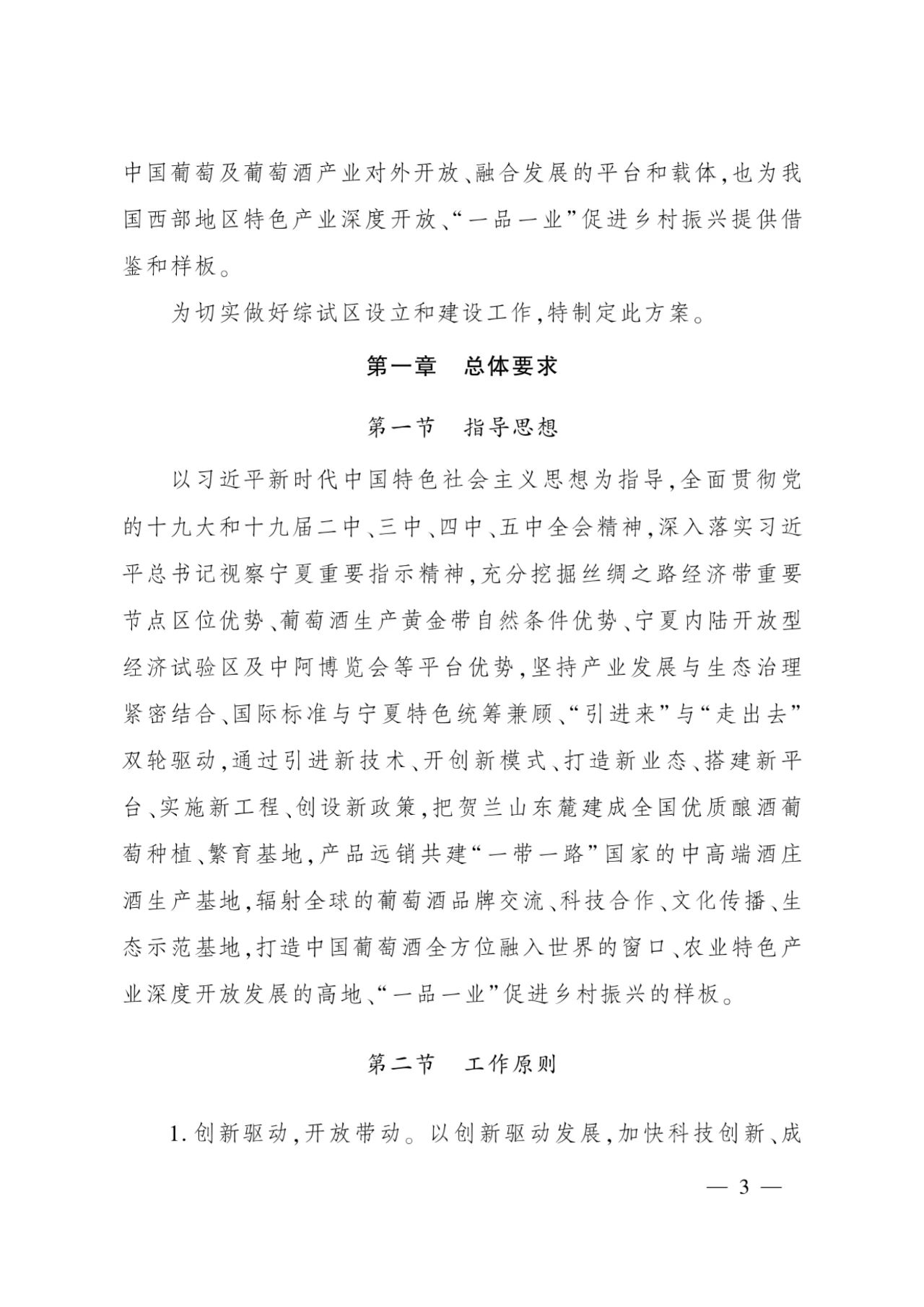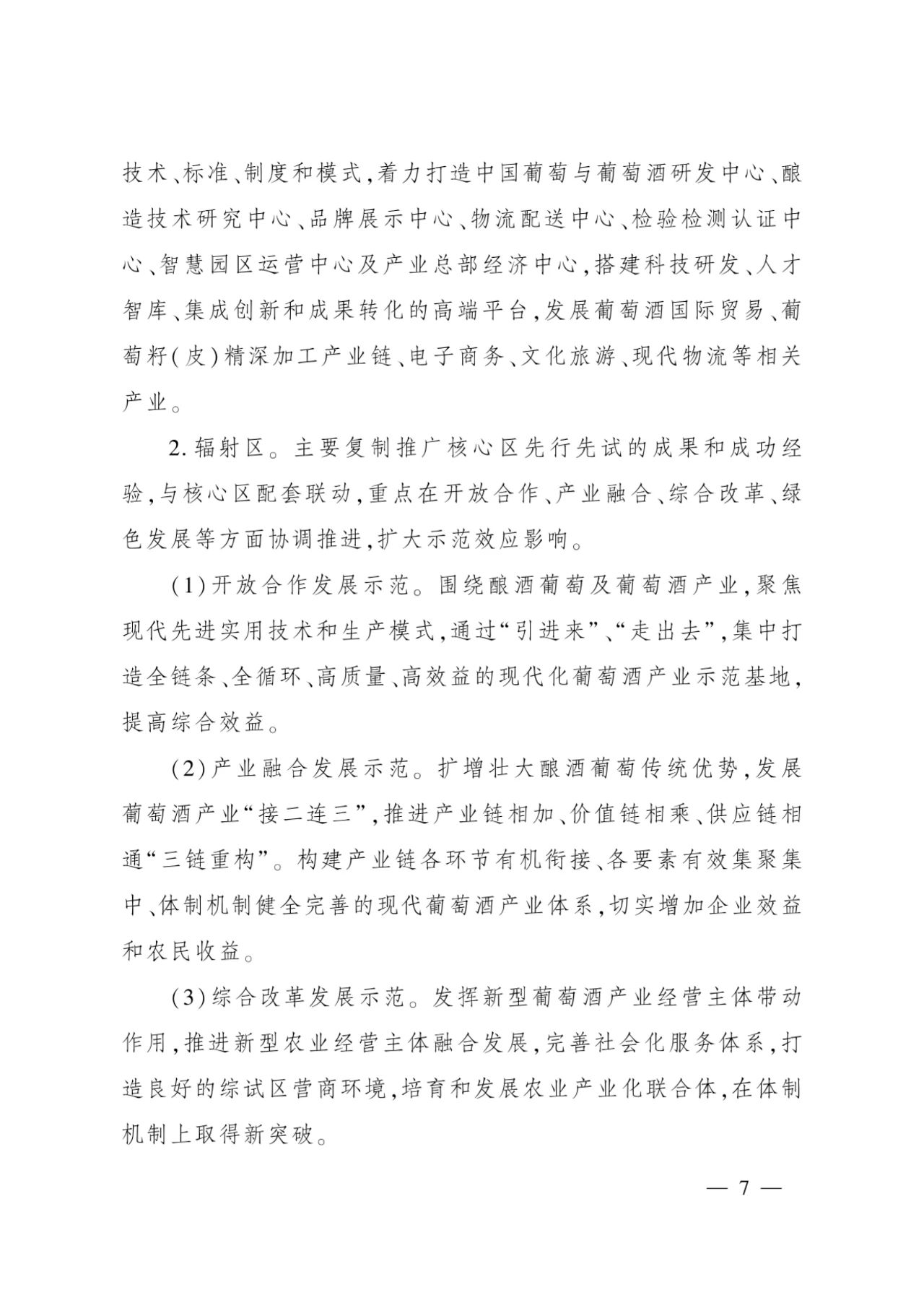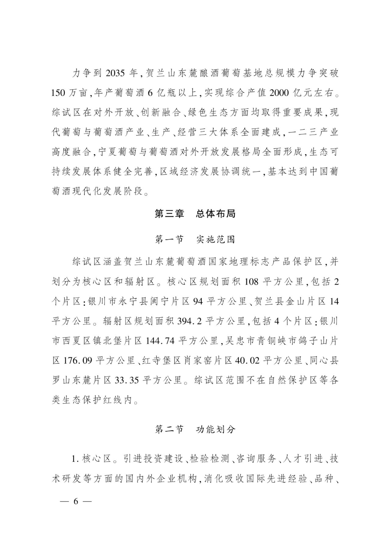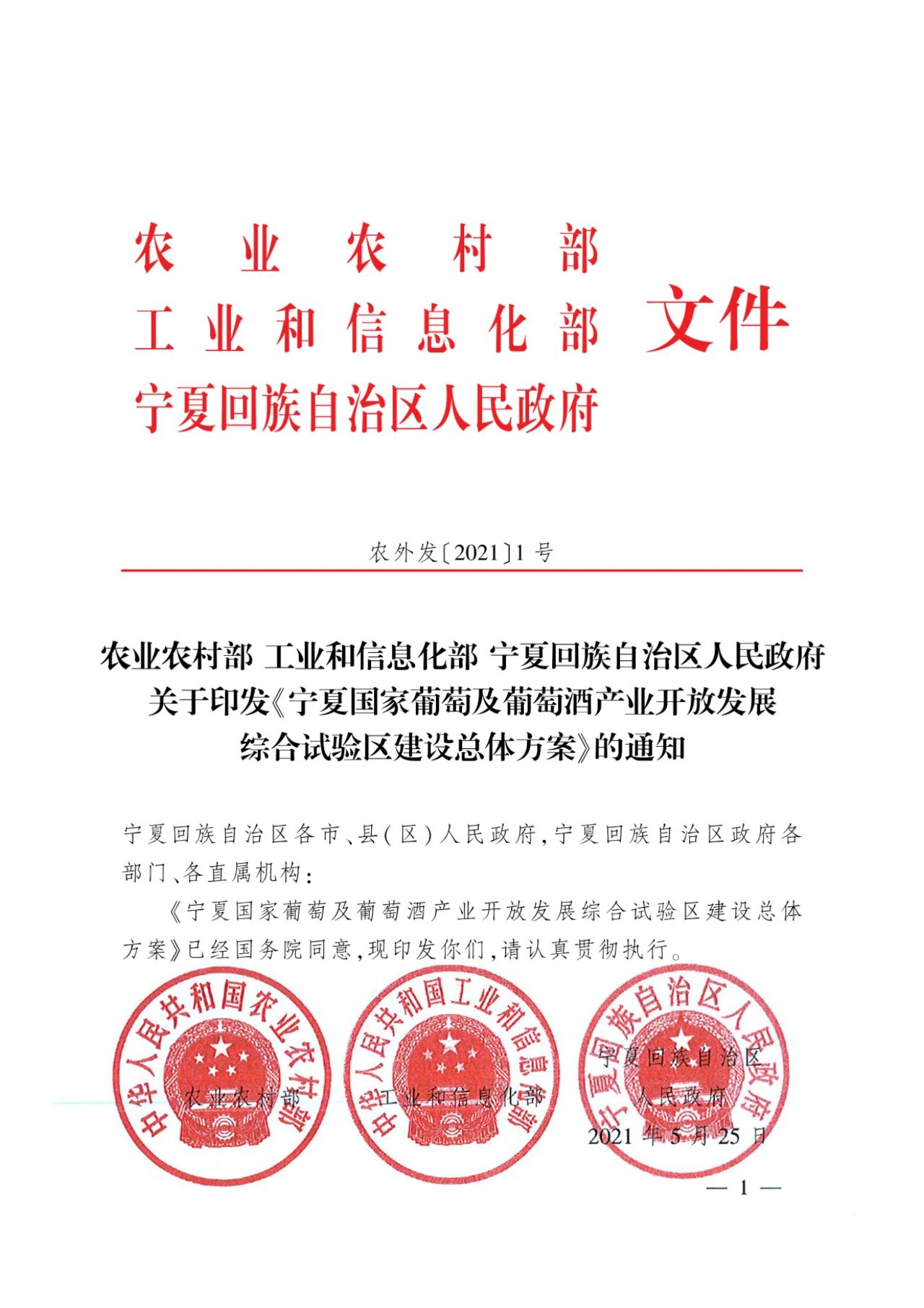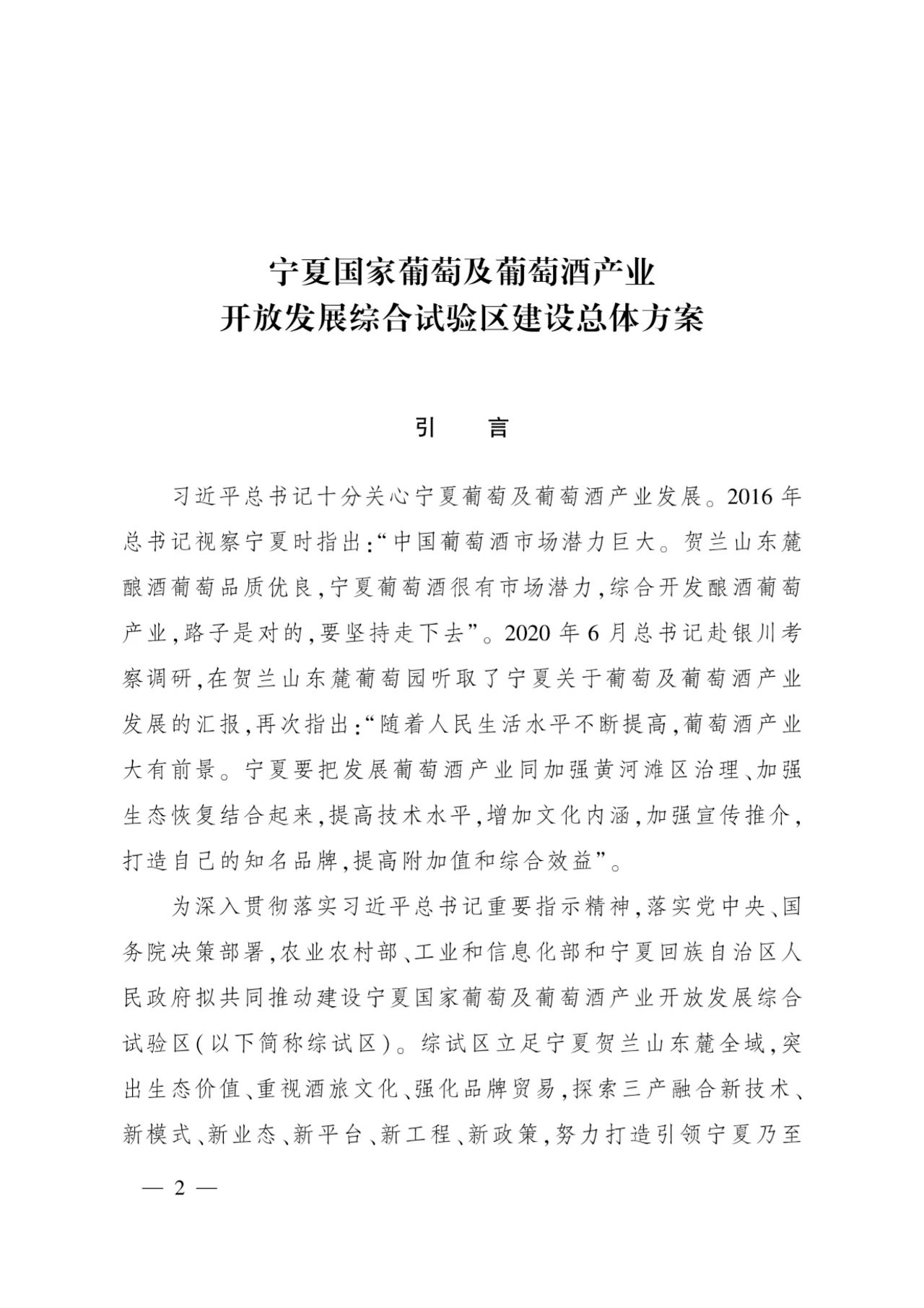 云酒头条(微信号:云酒头条)获悉,5月25日,农业农村部、工业和信息化部、宁夏回族自治区人民政府联合印发《宁夏葡萄及葡萄酒产业开放发展综合试验区建设总体方案》。 《方案》明确,力争到2025年,贺兰山东麓酿酒葡萄基地总规模力争达到100万亩,年产葡萄酒3亿瓶以上、实现综合产值1000亿元左右;力争到2035年,贺兰山东麓酿酒葡萄基地总规模力争突破150万亩,年产葡萄酒6亿瓶以上,实现综合产值2000亿元左右。 把贺兰山东麓建成全国优质酿酒葡萄种植、繁育基地,产品远销共建“一带一路”国家的中髙端酒庄酒生产基地,辐射全球的葡萄酒品牌交流、科技合作、文化传播、生态示范基地,打造中国葡萄酒全方位融入世界的窗口、农业特色产业深度开放发展的高地、“一品一业”促进乡村振兴的样板。 至2025年,宁夏将建立健全覆盖种植、酿造、销售全过程的质量安全追溯体系,推进葡萄酒产业与专业教育、文化旅游、康养休闲、生态富民等产业的全面融合,探索形成一批绿色生产、智慧化管控、利益联结的产业发展新模式,经济、社会、文化、生态效益进一步显现,农民群众在试验示范中得到实惠,获得感明显增强。 至2035年,综试区在对外开放、创新融合、绿色生态方面均取得重要成果,现代葡萄与葡萄酒产业、生产、经营三大体系全面建成,一二三产业高度融合,宁夏葡萄与葡萄酒对外开放发展格局全面形成,生态可持续发展体系健全完善,区域经济发展协调统一,基本达到中国葡萄酒现代化发展阶段。 根据方案,综试区涵盖贺兰山东麓葡萄酒国家地理标志产品保护区,并划分为核心区和辐射区。核心区规划面积108平方公里,包括2个片区:银川市永宁县闽宁片区94平方公里和贺兰县金山片区14平方公里。辐射区规划面积394.2平方公里,包括4个片区:银川市西夏区镇北堡片区144.74平方公里,吴忠市青铜峡市鸽子山片区176.09平方公里、红寺堡区肖家窑片区40.02平方公里、同心县罗山东麓片区33.35平方公里。综试区范围不在自然保护区等各类生态保护红线内。 以下为《方案》全文。