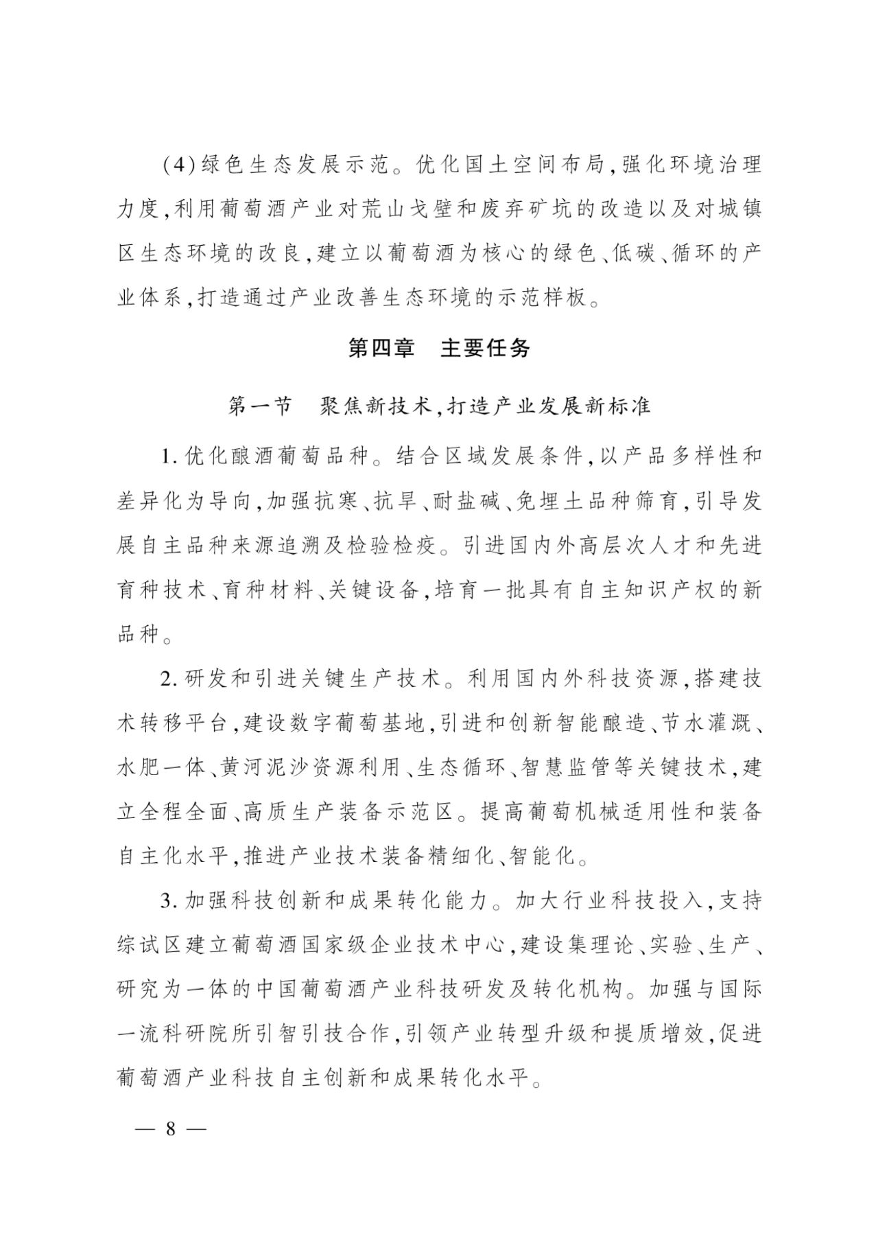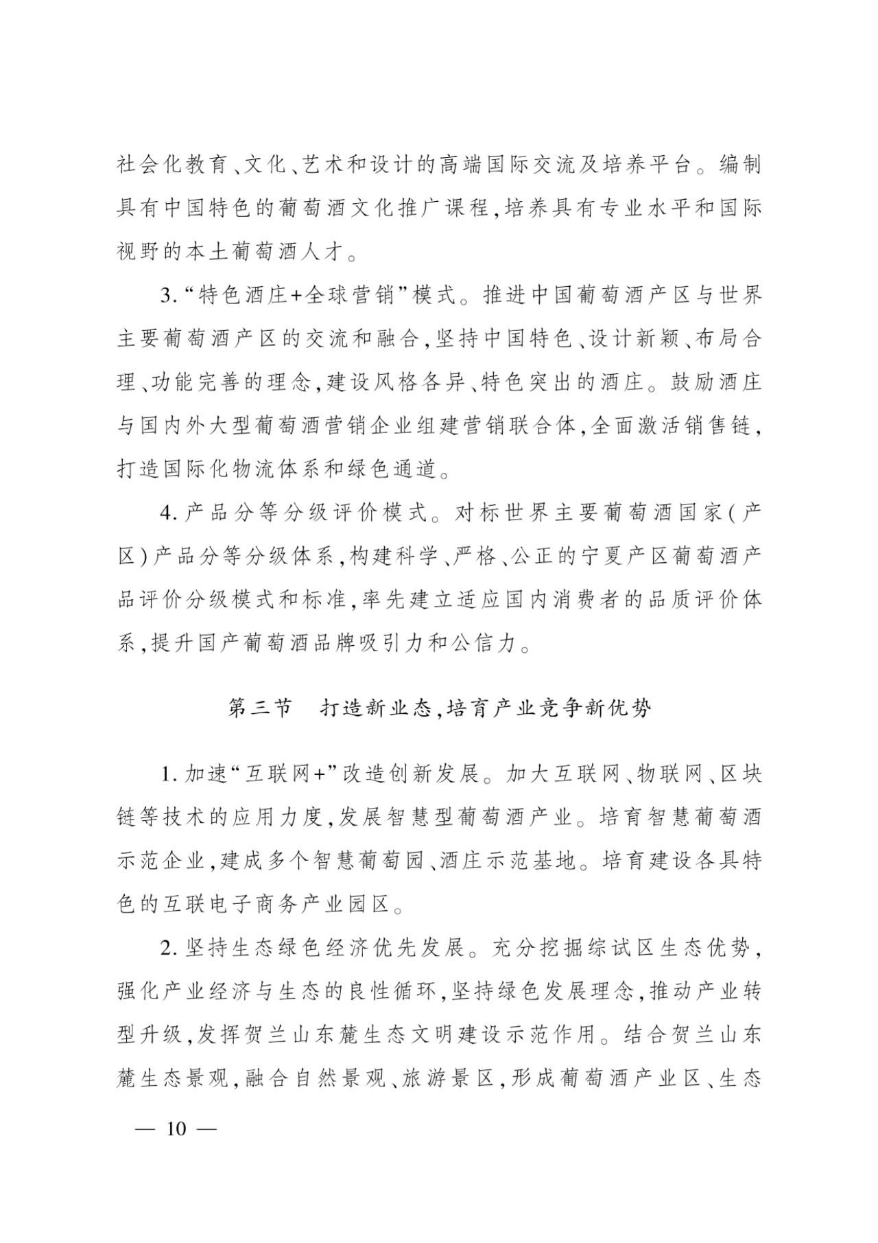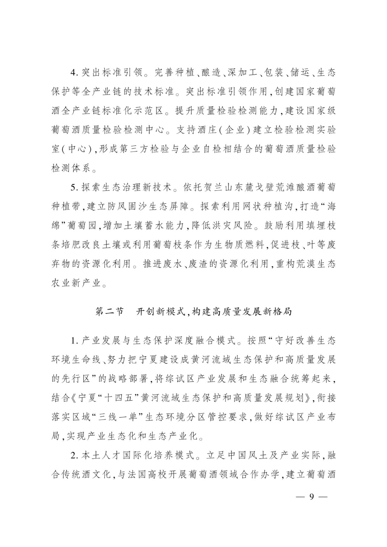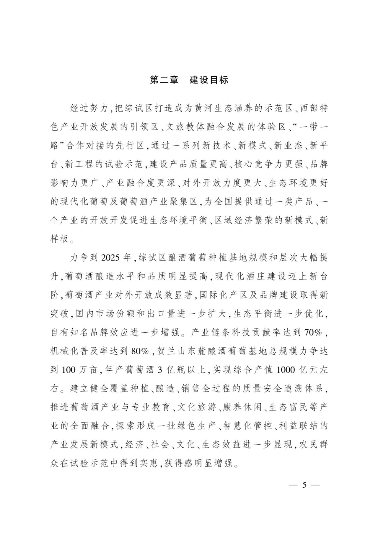云酒头条(微信号:云酒头条)获悉,5月25日,农业农村部、工业和信息化部、宁夏回族自治区人民政府联合印发《宁夏葡萄及葡萄酒产业开放发展综合试验区建设总体方案》。 《方案》明确,力争到2025年,贺兰山东麓酿酒葡萄基地总规模力争达到100万亩,年产葡萄酒3亿瓶以上、实现综合产值1000亿元左右;力争到2035年,贺兰山东麓酿酒葡萄基地总规模力争突破150万亩,年产葡萄酒6亿瓶以上,实现综合产值2000亿元左右。 把贺兰山东麓建成全国优质酿酒葡萄种植、繁育基地,产品远销共建“一带一路”国家的中髙端酒庄酒生产基地,辐射全球的葡萄酒品牌交流、科技合作、文化传播、生态示范基地,打造中国葡萄酒全方位融入世界的窗口、农业特色产业深度开放发展的高地、“一品一业”促进乡村振兴的样板。 至2025年,宁夏将建立健全覆盖种植、酿造、销售全过程的质量安全追溯体系,推进葡萄酒产业与专业教育、文化旅游、康养休闲、生态富民等产业的全面融合,探索形成一批绿色生产、智慧化管控、利益联结的产业发展新模式,经济、社会、文化、生态效益进一步显现,农民群众在试验示范中得到实惠,获得感明显增强。 至2035年,综试区在对外开放、创新融合、绿色生态方面均取得重要成果,现代葡萄与葡萄酒产业、生产、经营三大体系全面建成,一二三产业高度融合,宁夏葡萄与葡萄酒对外开放发展格局全面形成,生态可持续发展体系健全完善,区域经济发展协调统一,基本达到中国葡萄酒现代化发展阶段。 根据方案,综试区涵盖贺兰山东麓葡萄酒国家地理标志产品保护区,并划分为核心区和辐射区。核心区规划面积108平方公里,包括2个片区:银川市永宁县闽宁片区94平方公里和贺兰县金山片区14平方公里。辐射区规划面积394.2平方公里,包括4个片区:银川市西夏区镇北堡片区144.74平方公里,吴忠市青铜峡市鸽子山片区176.09平方公里、红寺堡区肖家窑片区40.02平方公里、同心县罗山东麓片区33.35平方公里。综试区范围不在自然保护区等各类生态保护红线内。 以下为《方案》全文。