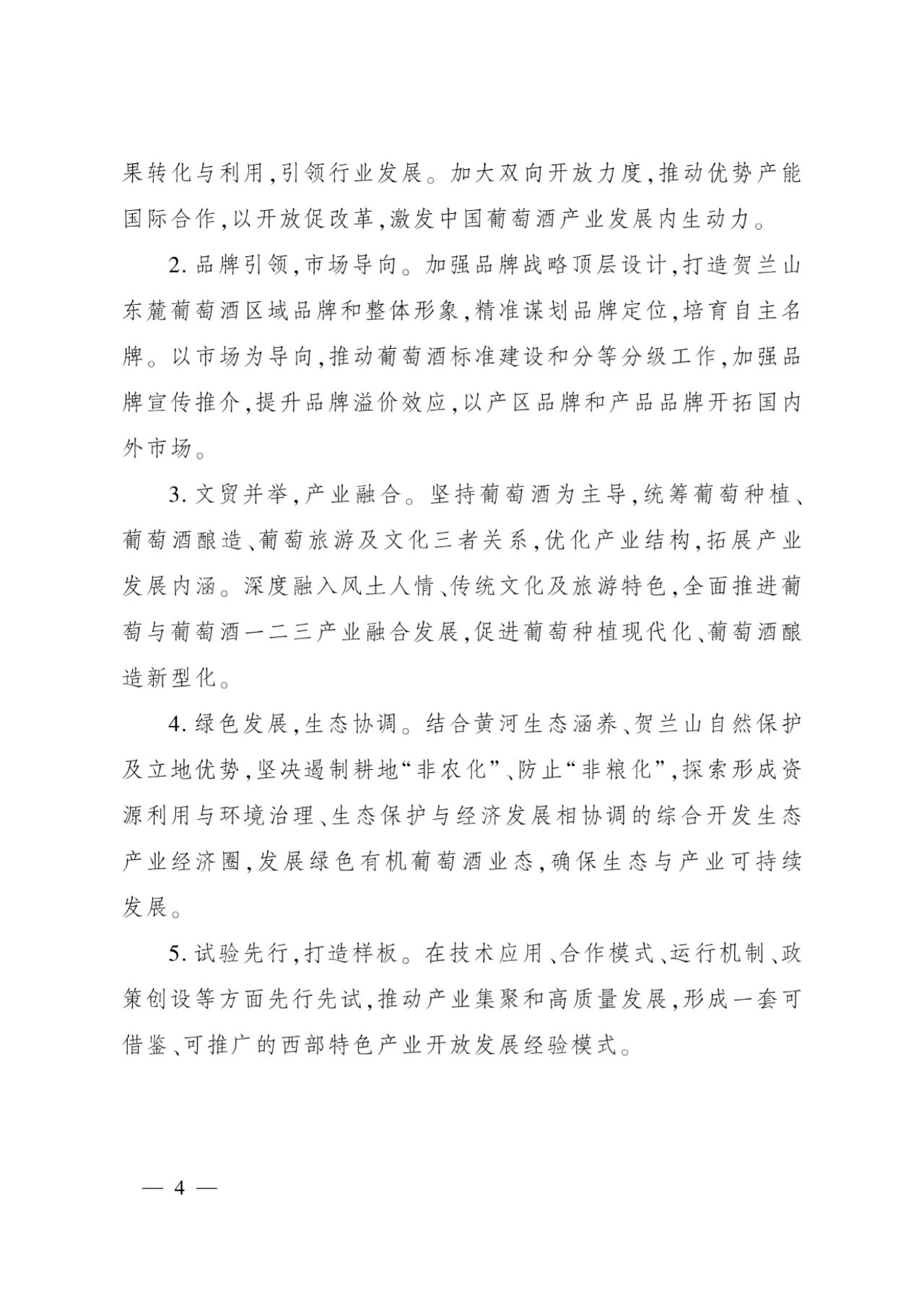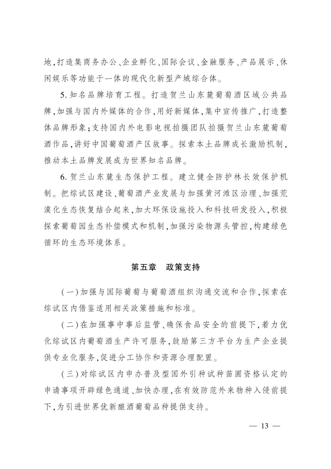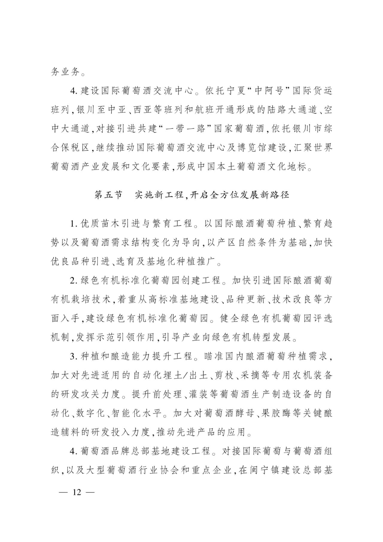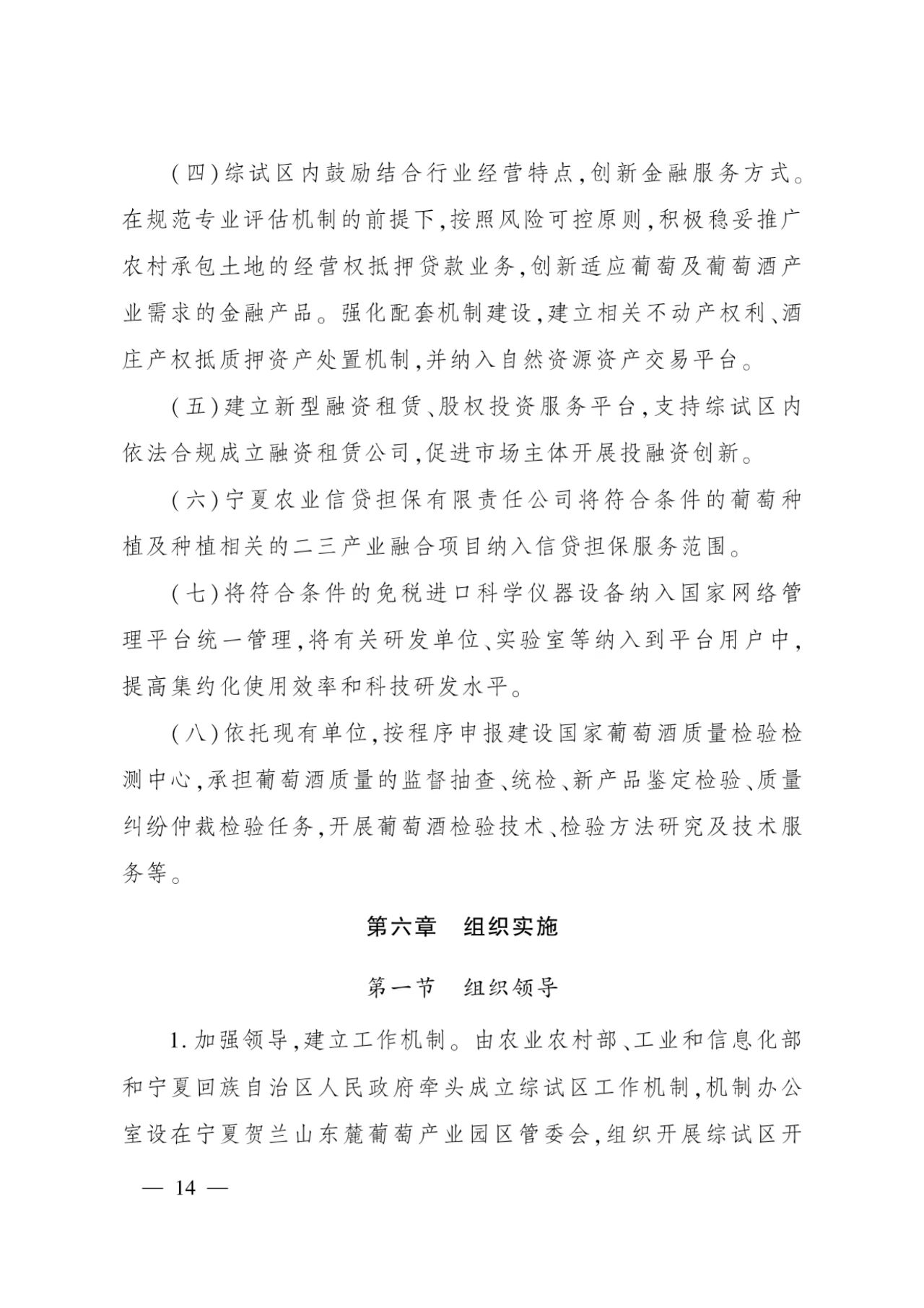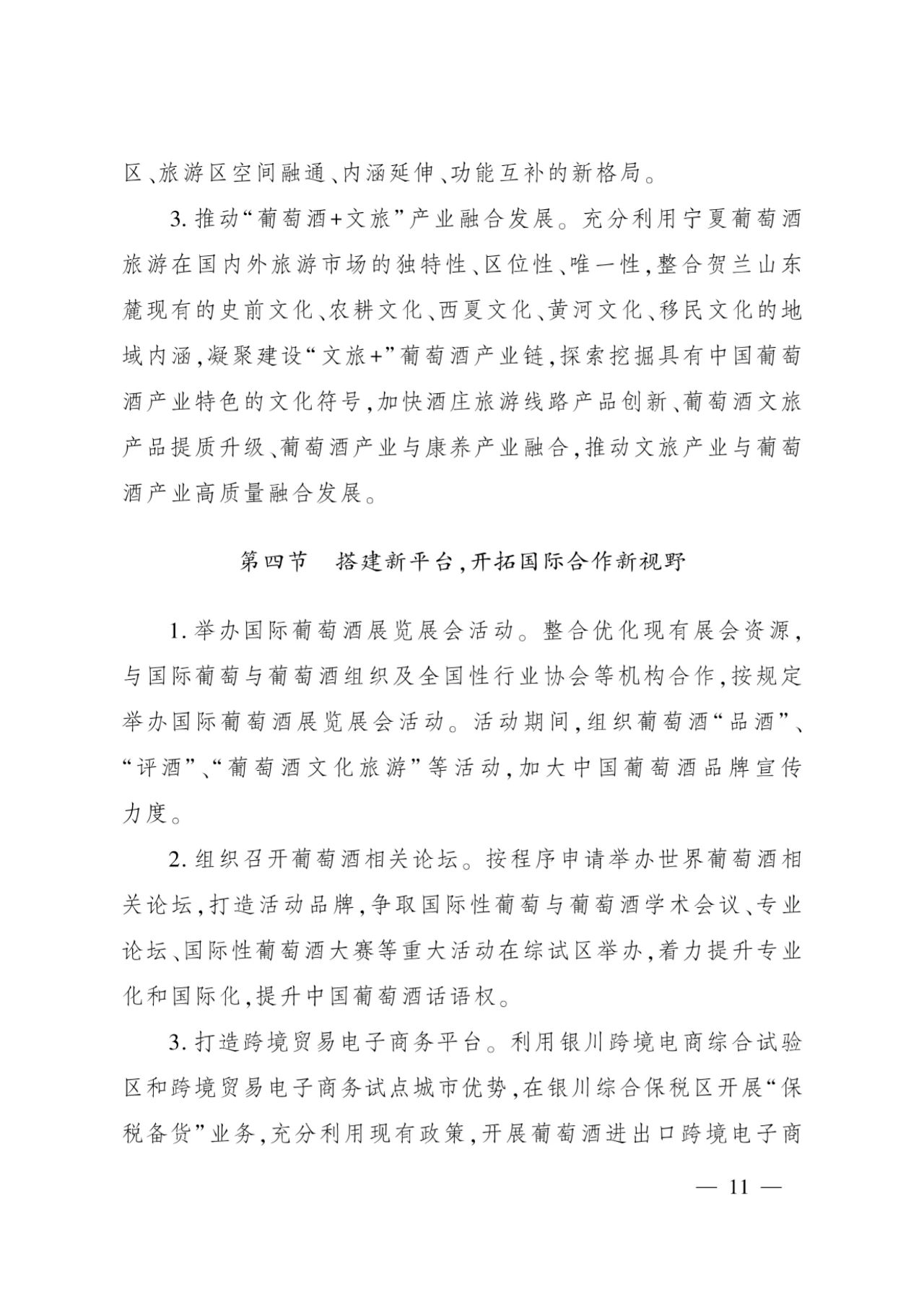 云酒头条(微信号:云酒头条)获悉,5月25日,农业农村部、工业和信息化部、宁夏回族自治区人民政府联合印发《宁夏葡萄及葡萄酒产业开放发展综合试验区建设总体方案》。 《方案》明确,力争到2025年,贺兰山东麓酿酒葡萄基地总规模力争达到100万亩,年产葡萄酒3亿瓶以上、实现综合产值1000亿元左右;力争到2035年,贺兰山东麓酿酒葡萄基地总规模力争突破150万亩,年产葡萄酒6亿瓶以上,实现综合产值2000亿元左右。 把贺兰山东麓建成全国优质酿酒葡萄种植、繁育基地,产品远销共建“一带一路”国家的中髙端酒庄酒生产基地,辐射全球的葡萄酒品牌交流、科技合作、文化传播、生态示范基地,打造中国葡萄酒全方位融入世界的窗口、农业特色产业深度开放发展的高地、“一品一业”促进乡村振兴的样板。 至2025年,宁夏将建立健全覆盖种植、酿造、销售全过程的质量安全追溯体系,推进葡萄酒产业与专业教育、文化旅游、康养休闲、生态富民等产业的全面融合,探索形成一批绿色生产、智慧化管控、利益联结的产业发展新模式,经济、社会、文化、生态效益进一步显现,农民群众在试验示范中得到实惠,获得感明显增强。 至2035年,综试区在对外开放、创新融合、绿色生态方面均取得重要成果,现代葡萄与葡萄酒产业、生产、经营三大体系全面建成,一二三产业高度融合,宁夏葡萄与葡萄酒对外开放发展格局全面形成,生态可持续发展体系健全完善,区域经济发展协调统一,基本达到中国葡萄酒现代化发展阶段。 根据方案,综试区涵盖贺兰山东麓葡萄酒国家地理标志产品保护区,并划分为核心区和辐射区。核心区规划面积108平方公里,包括2个片区:银川市永宁县闽宁片区94平方公里和贺兰县金山片区14平方公里。辐射区规划面积394.2平方公里,包括4个片区:银川市西夏区镇北堡片区144.74平方公里,吴忠市青铜峡市鸽子山片区176.09平方公里、红寺堡区肖家窑片区40.02平方公里、同心县罗山东麓片区33.35平方公里。综试区范围不在自然保护区等各类生态保护红线内。 以下为《方案》全文。
