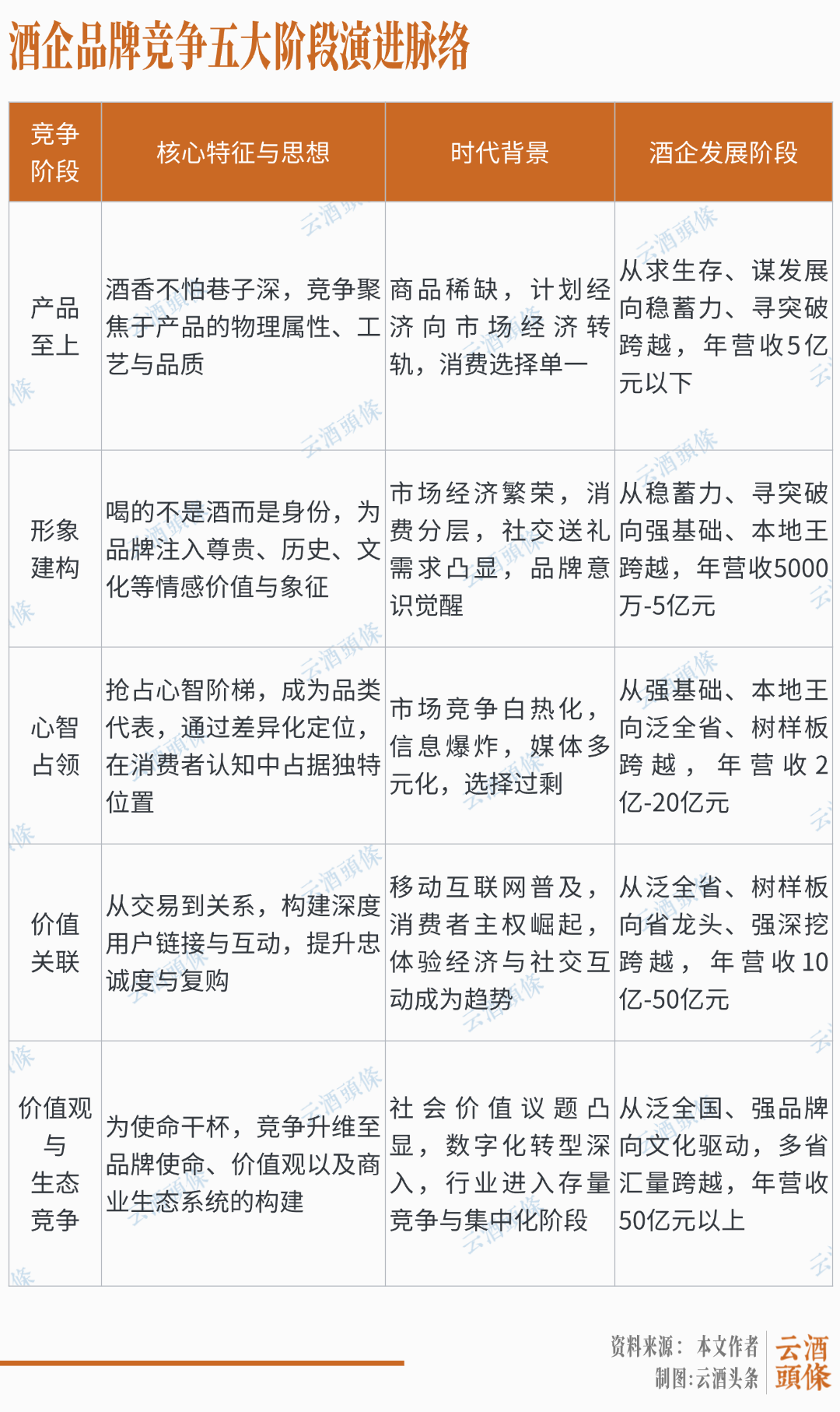 为什么有的酒企能穿越周期、持续增长,而有的却深陷“有规模无利润”的囚徒困境? 答案,并不全然隐藏在财报里,更深埋在品牌竞争的演进史中。 酒业竞争步入存量博弈,品牌成为穿越周期的核心密钥。笔者通过复盘行业四十余年品牌竞争五大演进阶段,从产品至上到价值观与生态竞争,层层叠加的能力体系勾勒出酒企品牌发展的清晰脉络。 文中锚定品牌阶段与营收规模的动态匹配关系,拆解不同发展阶段的品牌建设重心,给出可落地的资源配比模型与战略罗盘。愿这份复盘,为酒企找准品牌坐标、破解增长瓶颈提供思路,在价值主导的新竞争时代,以科学的品牌战略筑牢发展根基。 为何要复盘酒业品牌竞争之路? “温故而知新”。系统性复盘酒业四十余年的品牌竞争之路,目的绝非怀旧,而是为了解码未来。 在行业面临深度调整、竞争从“增量抢夺”转向“存量博弈”的当下,品牌已不再是锦上添花的装饰,而是企业能否活下去、走得远的核心与“通行证”。盲目跟风,或固步自封,都无异于在这场没有终局的竞争中主动退场。 此次复盘,旨在为您提供一套清晰的“品牌竞争战略罗盘”,其价值在于厘清品牌竞争从“产品”到“价值观”的演进逻辑,看透从“有什么喝什么”到“为什么而喝”的时代本质;帮助酒企精准标定自身品牌在历史坐标中的方位,瞬间识别能力长板与致命短板;为不同发展阶段、不同资源禀赋的酒企,提供可立即上手的品牌建设路径与精准的资源配比模型。 酒企品牌竞争五大阶段概览 我们深刻认识到,品牌是酒企穿越发展周期的核心。对过去四十余年品牌竞争历程的复盘,本质上是对酒企成长核心动力的溯源。 要理解这张图谱,必须首先厘清一个核心关系:品牌发展阶段与酒企营收规模发展阶段(可回顾全面复盘酒企八大发展阶段,和君万字详解精准破局策略)并非相互独立,而是动态匹配、相互依存的战略一体关系。 我们可以这样理解,酒企发展阶段是“战略地图”,它清晰地定义了企业“在何处、欲往何方”;而品牌发展阶段是“动力系统”,它决定了企业“凭什么去、能否到达”。 成功的酒企,其品牌建设总是适度超前或同步于其规模扩张。品牌能力是冲破每一个营收坎级,实现阶段性跃迁的 “通行证”。若品牌能力滞后于企业规模,企业将不可避免地陷入“有渠道无动销、有规模无利润”的增长瓶颈。 基于这一核心关系,我们梳理出酒企品牌竞争的五大阶段,及其与企业发展阶段的对应关系,形成如下战略对标框架: 需要再次强调的是,这五大品牌阶段并非线性的替代关系,而是层层叠加、复合共存的能力体系。在当下的竞争环境中,一个成功的品牌需要具备这五种核心竞争能力:产品力、形象力、定位力、用户关系、价值观与生态。 酒企的真正挑战在于,如何根据自身发展阶段中所处的位置,动态地、有侧重地配置资源,绘制属于自己的 “品牌能力配置图” ,确保品牌这台“引擎”的动力,足以驱动企业驶向下一站。接下来,我们将对这五个阶段进行深度解析。 酒业品牌竞争五个阶段的深度解析 第一阶段:产品至上(1980年-1990年初) 1、核心特征:“酒香不怕巷子深” 这是一个物质尚不丰裕,但信仰极其纯粹的时代。消费者的选择简单而直接:哪家酒好,就喝哪家。 品牌的竞争舞台,牢牢扎根于厂房、窖池与车间。竞争的核心台词只有一句:“我的酒,比你的好。” 好在哪里?好在传承数代的工艺,好在得天独厚的产区,好在岁月沉淀的老窖池。 广告与营销远未像今天这般无孔不入,一款酒能否成为传奇,全靠其本身能否在口碑的江湖里,飘出最远、最醇厚的“酒香”。 2、酒业案例 茅台与“12987”工艺的极致坚持。一年生产周期、两次投料、九次蒸煮、八次发酵、七次取酒。这套复杂到近乎严苛的工艺,成为茅台不可撼动的品质基石。它无需多言,其工艺本身,就是一部最动人的品牌史诗。 汾酒的“地缸分离发酵”。汾酒强调其采用清蒸清烧、地缸分离发酵的工艺,以此确保酒体的“清”与“净”,从而在清香型白酒中树立起纯粹、干净的品质标杆。 “国家评酒会”的金字招牌。全国评酒会犹如酒业的“奥斯卡”,各大名酒为此激烈角逐。一枚金奖奖牌,就是通往畅销之路的“硬通货”,是产品力最权威的官方认证,被直接印在瓶身上,成为一代人最深刻的品质记忆。 3、理论支撑:USP理论,即独特的销售主张 这个时代的竞争逻辑,完美契合了广告大师罗瑟·里夫斯提出的USP理论。其核心在于,每一个品牌都必须向消费者提供一个独特、明确、且极具说服力的产品物理优势。 在产品至上时代,品牌的“台词”无外乎:“我拥有独一无二的工艺”“我产自不可复制的核心产区”“我获得了最高级别的品质认证”。一切传播,都围绕着这个独一无二的物理价值点展开重复与强化。 4、对应阶段:“求生存,谋发展”至“稳蓄力、寻突破”,年营收5亿元以下 对于处于这一发展区间的酒企而言,生存是第一要务。集中所有资源,打造出一款在品质、口感或工艺上具有明确竞争力的核心单品,是在区域市场立足、形成初始消费记忆的根本。在此阶段,过度谈论品牌使命或生态构建无异于空中楼阁,夯实“产品”这一根基,是唯一的正途。 第二阶段:形象建构(上世纪九十年代中后期) 1、核心特征:“喝的不是酒,是身份与象征”。 随着市场经济的