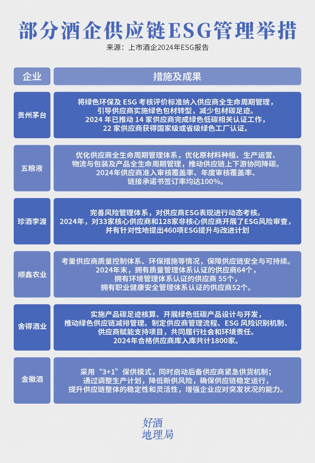 值得注意的是,酒企ESG报告中,开始关注绿色供应链的建设。如贵州茅台、珍酒李渡等企业都对供应商提出了绿色发展要求,评估供应商的ESG表现情况,从而进一步推动生产的绿色低碳。