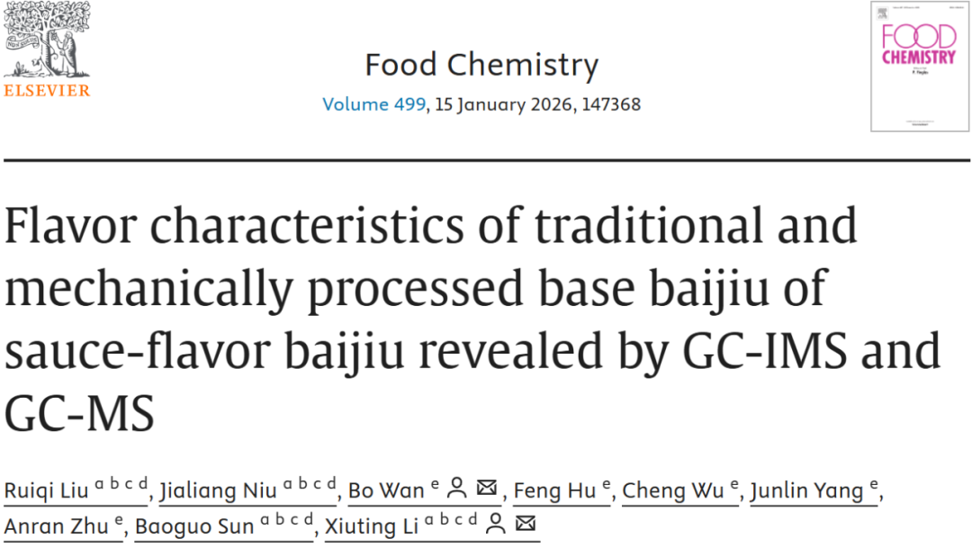 12月1日,北京工商大学孙宝国院士团队在国际学术期刊《Food Chemistry》(食品化学,Q1,IF=9.8)上发表题为《Flavor characteristics of traditional and mechanically processed base baijiu of sauce-flavor baijiu revealed by GC-IMS and GC-MS》(以GC-IMS和GC-MS揭示传统及机械加工酱香型白酒基酒的风味特性)的论文。