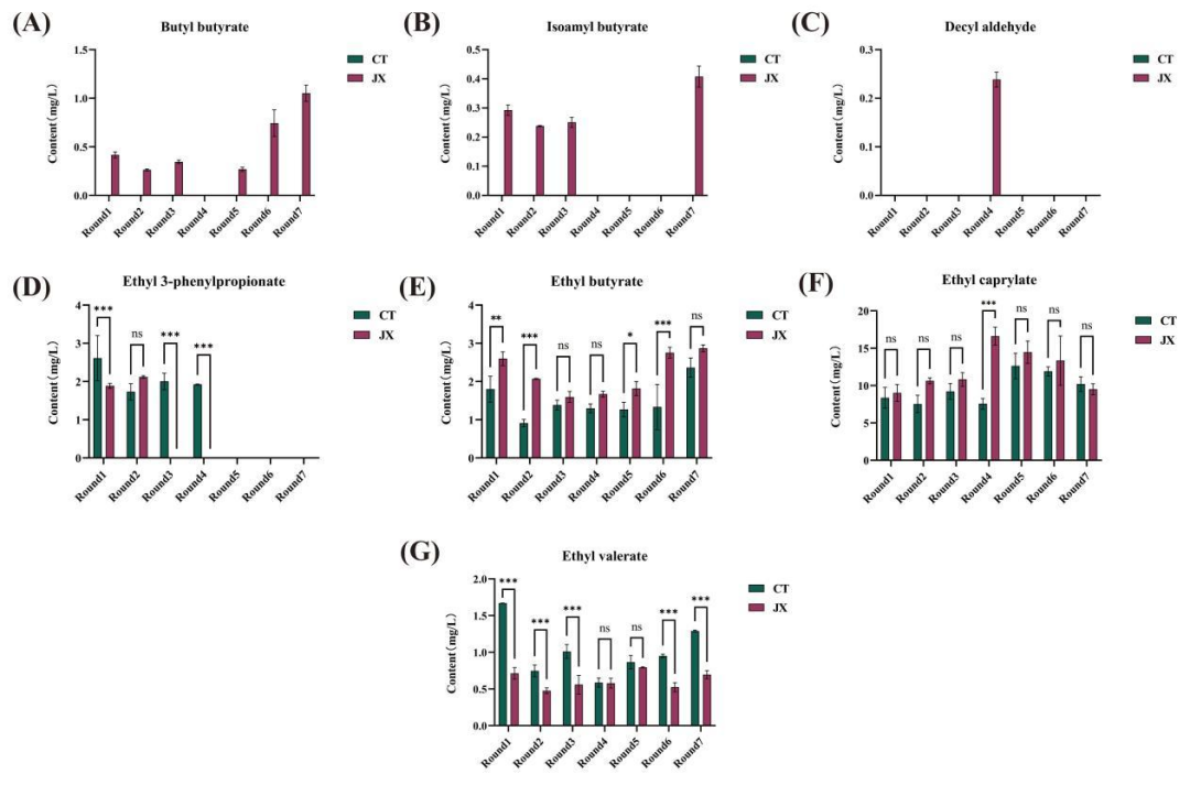 通过GC-MS进一步分析后,研究共鉴定了104种挥发物,传统组样品在第1与第6轮的化合物数量显著高于机械组样品,并且在某些轮次中还出现丙酸丙酯、戊酸丙酯等独有化合物,进一步增强了传统工艺特有的多维香气结构。与此同时,机械组样品的己酸乙酯、丁酸乙酯等果香型酯类含量相对更高,呈现更明快的果香风格,而传统工艺中糠醛与酮类物质更为丰富,使其香气发展更加缓慢而深沉。