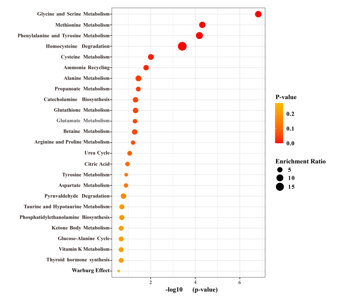 在进一步筛选出真正对香气有贡献的活性物质(OAV>1)后,研究团队对这些关键风味分子的代谢来源进行了KEGG通路富集分析。结果显示:甘氨酸与丝氨酸代谢、甲硫氨酸代谢以及苯丙氨酸和酪氨酸代谢,是这些香气物质产生的最核心生化路径。