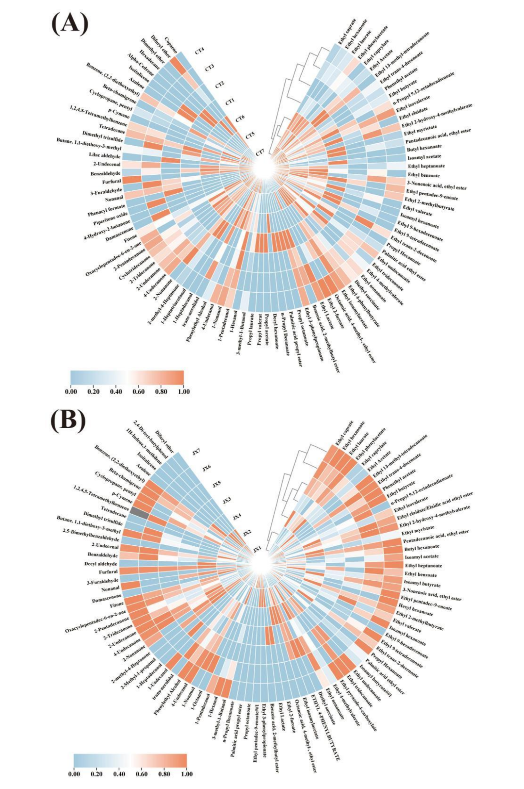 ▎两种生产方法下基酒样品中挥发性物质的热图:(A)为传统工艺,(B)为机械化工艺。图源@Food Chemistry