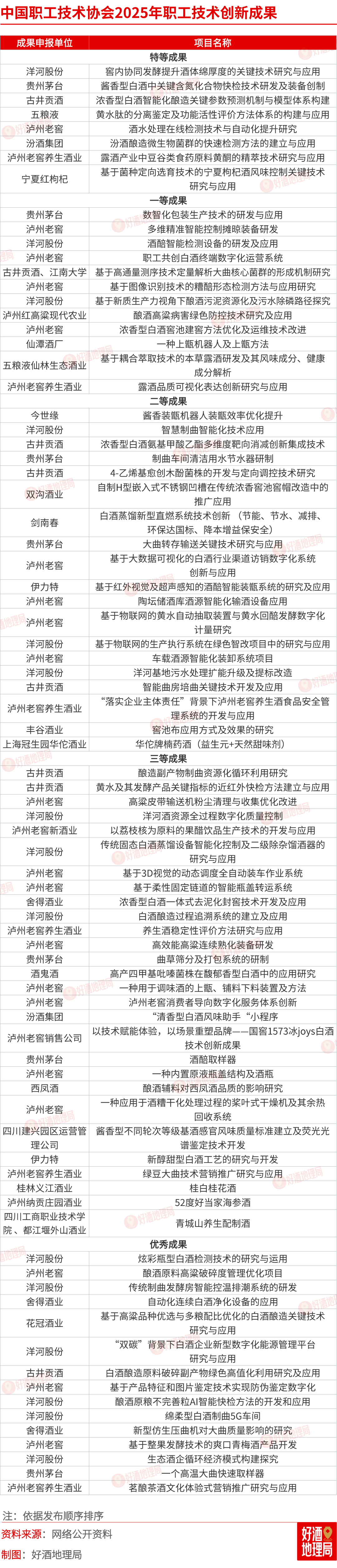 近日,中国职工技术协会公示了2025年职工技术创新成果,包括92项特等成果(酒类8项)、145项一等成果(酒类12项)、235项二等成果(酒类19项)、288项三等成果(酒类28项)、137项优秀成果(酒类15项)。具体入选名单如下图。(中国职工技术协会)