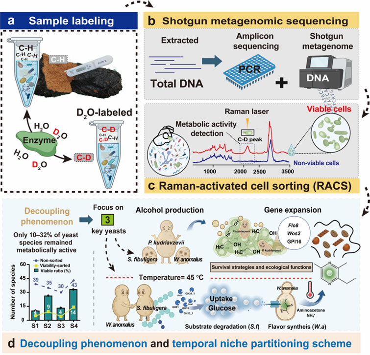 长期以来,白酒、食品及生物制造等泛发酵工业普遍面临微生物群落结构复杂、发酵环境条件严苛等问题。传统多组学技术虽然能够描绘发酵体系中微生物的“组成图谱”,但在高温等极端条件下,哪些微生物仍保持活性并真正参与发酵过程,始终缺乏有效判别手段。这一问题不仅影响发酵机理的深入理解,也制约了关键功能菌的筛选和发酵过程的精准调控。