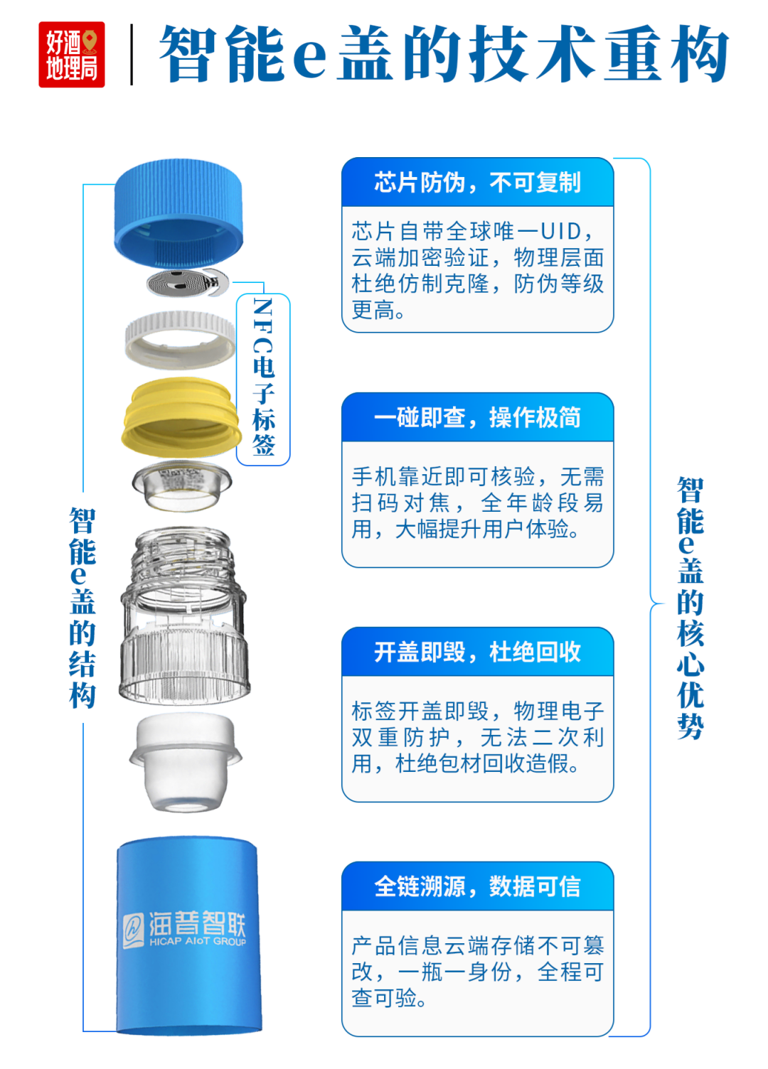智能e盖没有试图在二维码上继续叠加复杂规则,而是直接更换了底层逻辑,将国密级NFC安全芯片嵌入瓶盖结构,以瓶盖物理结构、NFC安全芯片与关联二维码形成组合,重写防伪与数据的关系。