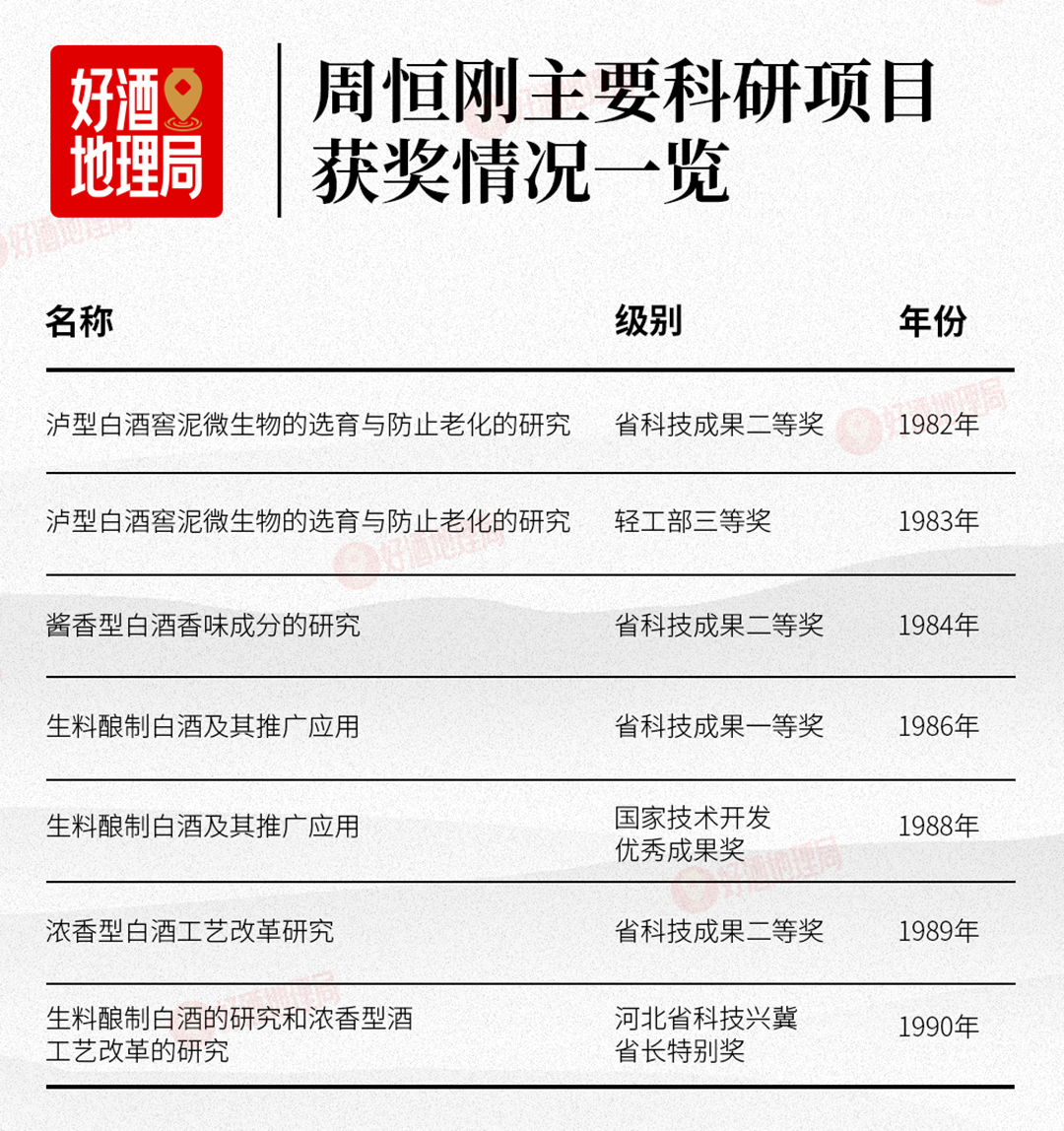 由周恒刚主导的《泸型白酒窖泥微生物的选育与防止老化的研究》《酱香型白酒香味成分的研究》《生料酿制白酒及其推广应用》《浓香型白酒工艺改革研究》等科研工作,多次获得国家和部省级嘉奖。