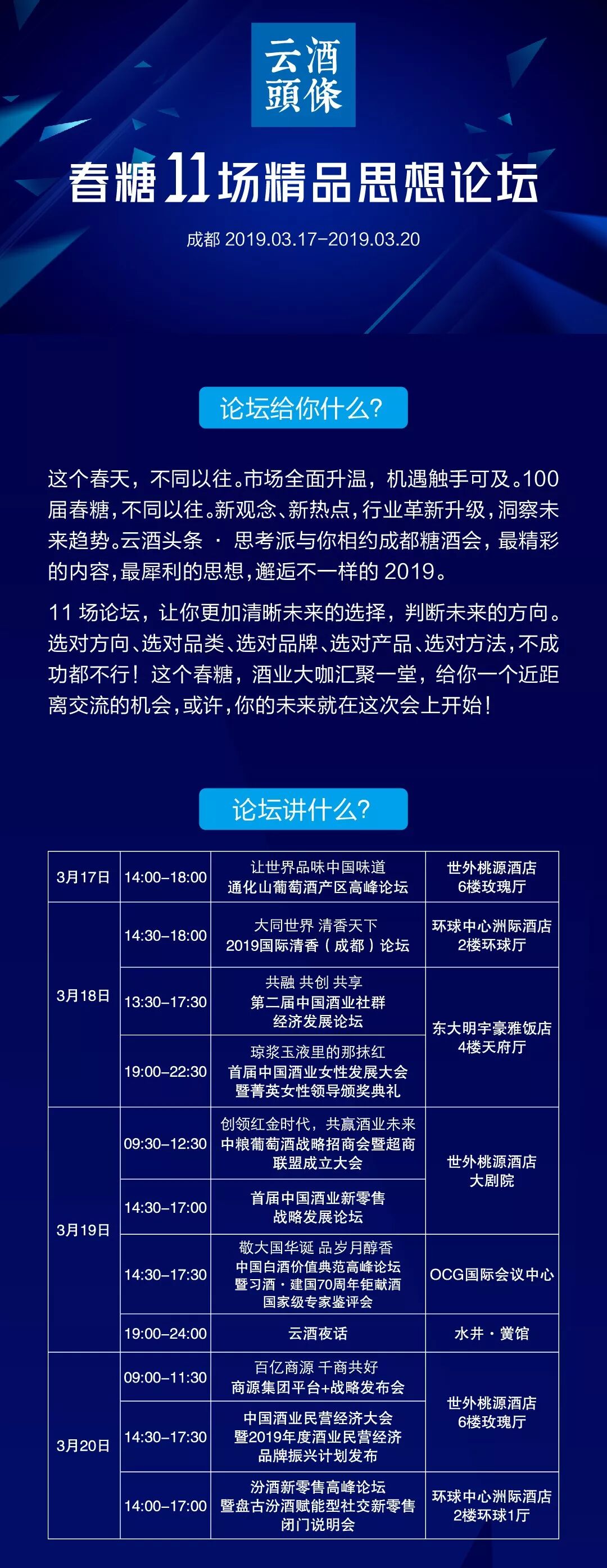 春糖即将开幕,无论是即将参展的厂商,还是即将出发奔赴成都逛展的酒商,都早已摩拳擦掌,开始筹划一年一度的“春糖之约”了。 春糖究竟看什么?了解自己意向产品或品类的发展趋势,挖掘春糖那些被众多企业集中推介的产品系列,厘清厂家在价格体系、市场费用支持、广告支持等方面的各项政策……当然更有效的途径,还是和论坛上的大咖交流互动,学习最前沿的行业观点,这样的糖酒会,或许才算是不虚此行。 小嫚特地为各位参展商准备了一份“春糖逛展明白卡”。揣着它,春糖动态与商机一手掌握,随附逛展小贴士,整理行李前记得留意下哦。 ❶ 春糖大咖都去哪?11场论坛带你智寻未来 每届糖酒会,门类众多的论坛活动可谓让参展商们“挑花了眼”。唯有干货满满,直指未来趋势的观点,才值得为之驻足。 小嫚特意为你筛选出11场经典活动,涵盖不同种类的酒种、香型、渠道,现场还有各领域的专家学者,名酒、大商背后的企业家领袖,与他们零距离接触,定会让你有所收获。 2018年,国产葡萄酒品牌和产区表现较好,有国产酒已经实现翻番增长。3月17日下午,在通化山葡萄酒产区高峰论坛(世外桃源酒店6楼玫瑰厅),品中国味道,发现国货潮下,国产酒的大机会。 扫码报名 白酒越来越国际化,下一个品类机会在哪里?中国清香型白酒与世界主流蒸馏的口感如出一辙,是全世界通用的最好语言。3月18日下午,2019国际清香(成都)论坛,国内清香型白酒主流企业首次齐聚,给你一站式了解清香品类的绝佳机会。 扫码报名 老经验卖酒不灵了?原来,从小米手机到江小白、李渡,是社群改变了无数品牌的命运。锁定第二届中国酒业社群经济发展论坛,听神秘嘉宾带来7万会员5亿流水的实战案例。 扫码报名 2018年,除了女性酒类消费的崛起,在酒业还活跃着一批女企业家。3月18日晚,聚焦首届中国酒业女性发展大会暨菁英女性领导颁奖典礼,你想结识的酒业女企业家,都在这里了。 扫码报名 “赢葡萄酒,就是赢未来。”3月19日上午,,请锁定中粮葡萄酒战略招商会暨超商联盟成立大会。听行业协会将权威深度解析酒业发展的新机遇,富邑首任全球首席运营官首次开讲,尼尔森研究报告解读酒类消费新趋势…… 扫码报名 “未来五年,60%的夫妻店将面临倒闭危机。”2018年酒业新零售迎来大爆发,烟酒店该如何续命?新零售该如何做?3月19日下午,来首届中国酒业新零售战略发展论坛,你将收获答案。 扫码报名 2018年,茅台集团习酒公司成为中国酒业增速最高、发展最快的企业,如今正处于高速上升阶段,在市场布局、政策扶持等诸多方面为酒商留足了合作空间。3月19日下午,习酒公司党委书记、董事长钟方达与您相约中国白酒价值典范高峰论坛。 扫码报名 思想走多远,酒业就能走多远。“酒业思考派”云酒头条汇聚一众酒业大咖,在世界最古老的酿酒作坊——水井·黉馆办学开课,酒业新思想、新趋势、新机会、新模式,行业最劲爆的话题、内容,尽在云酒夜话。 扫码报名 在酒业传统大商中,商源最具创新基因。朱跃明是中国酒商的标志性人物,经历了酒类商业各个形态阶段,尝试了各种商业模式。今年春糖,商源推出百亿战略计划,如何实现?对酒商又有何机会?请来现场听朱跃明聊聊。 扫码报名 面对卖酒难、传播难、发展难……民营酒企酒商痛点,中国酒业民营经济大会将一站帮你解决。全国工商联原副主席、中国民营经济研究会会长庄聪生将现场支招。大会还将发布2019年度酒业民营经济品牌振兴计划,为民营企业送出三大福利。 扫码报名 没有广告、没有推广、只靠模式和产品的净销力,盘古汾酒上市仅一年,即招募合伙人近百名,实现销售10万余箱。这家白酒厂商玩转新零售靠的是什么?现场给你答案…… 扫码报名 ❷ 酒店展挑花了眼?锁定它们令你事半功倍 本届糖酒会酒店展,自3月15日起将拉开帷幕,小嫚特整理一份酒店名单,带你一起明明白白逛春糖。 ❸ 三条小提示,让你的糖酒会游刃有余 时间及门票: 除了前期的酒店展之外,3月21日-3月23日,第100届全国糖酒会也将拉开帷幕,期间每日展出时间为09:00-17:30。 此外,本届糖酒会会展门票价格分别为:开展首日100元,第二天和第三天为20元。 交通: 本届糖酒会将在中国西部国际博览城(四川省成都市天府新区福州路东段88号)召开。 ▲中国西部国际博览城 中国西部国际博览城(西博城)位于国家级新区——四川天府新区的核心区域,总建筑面积57万平方米,其中场馆总展览面积30.5万平方米,是中国西部国际博览会永久会址、各类会展主办场地、高端商务活动中心平台,是推动中国中西部会展产业发展的新兴增长极,着力打造面向“一带一路”建设和长江经济带发展的国际交流合作重要平台。 如何前往西博城,小嫚已经帮你探好路啦,记得查收哦。 展区布局方面,大家关注的酒类展馆集中分布于14-16号馆。同时,二层7-8号馆、12-13号馆为葡萄酒及国际烈酒展区。 天气: 糖酒会期间,成都天气以阴雨为主,平均温度在7-16度之间,风力较小,但外出仍需注意防雨。小嫚建议大家出发前准备好套装、夹衣、风衣、休闲装、夹克衫、西装、薄毛衣等保暖衣物,展会期间提前安排出行时间,避免因雨天导致车辆拥堵延误行程哦。 祝大家在百届糖酒会发现新商机,结交新朋友,云酒小嫚与大家不见不散,成都见!