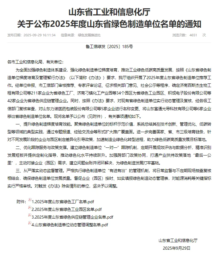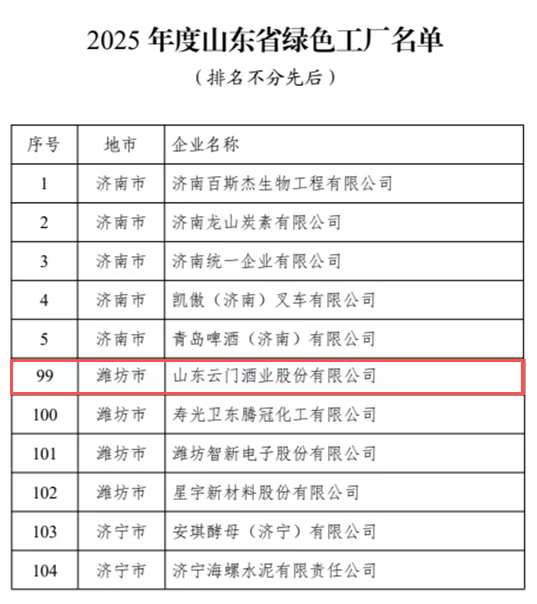 近日,山东省工业和信息化厅正式公布“2025年度山东省绿色工厂名单“,云门酒业凭借在生态酿造、节能降耗等方面的系统化实践与突出成效成功入选,成为鲁酒板块绿色制造单位标杆企业。