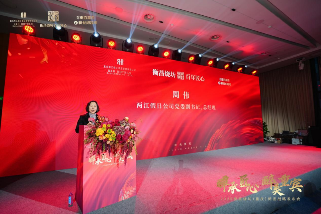 随后,两江假日公司党委副书记、总经理周伟女士致辞。周伟深情回顾了“重宾”品牌与酒文化的深厚渊源。自1956年重庆宾馆诞生以来,“重宾酒”便作为款待贵宾、见证荣耀的“胜利之酒”,承载着厚重的城市记忆与品质坚守。他表示,作为“重宾”品牌的持有者,两江假日公司始终致力于让这段历史在新时代焕发活力。与衡昌烧坊的合作,源于双方对传统工艺与卓越品质的共同追求,是“匠心与初心的共振”。他指出,三方携手是“历史与现代的交融”,“重宾甄选”酒正是这份交融的结晶,凝聚了半个多世纪的时光沉淀与三方对品质的共同承诺,期待它成为代表重庆热情的“味觉名片”。
