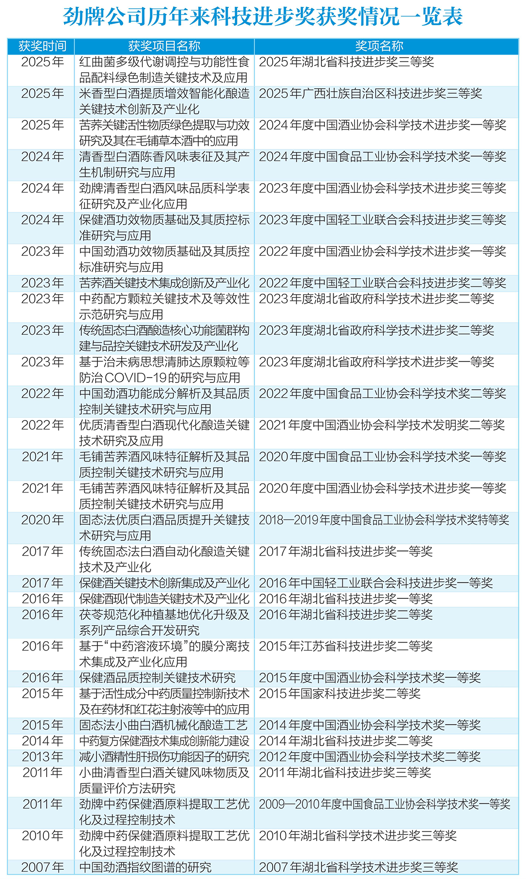 截至2025年底,劲牌累计获授权专利266项,其中发明专利144项,多项成果获中国酒业协会科学技术进步奖一等奖等重要奖项,彰显人才作为创新第一资源的核心价值。