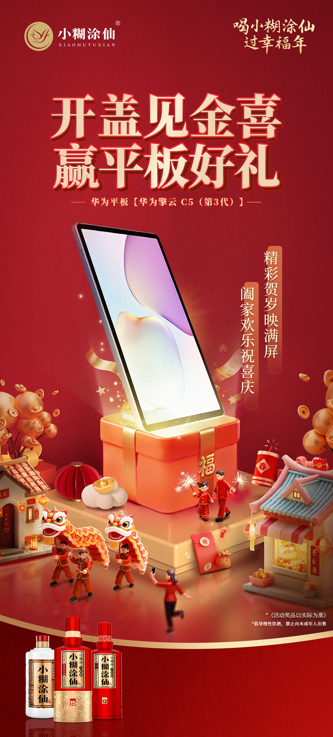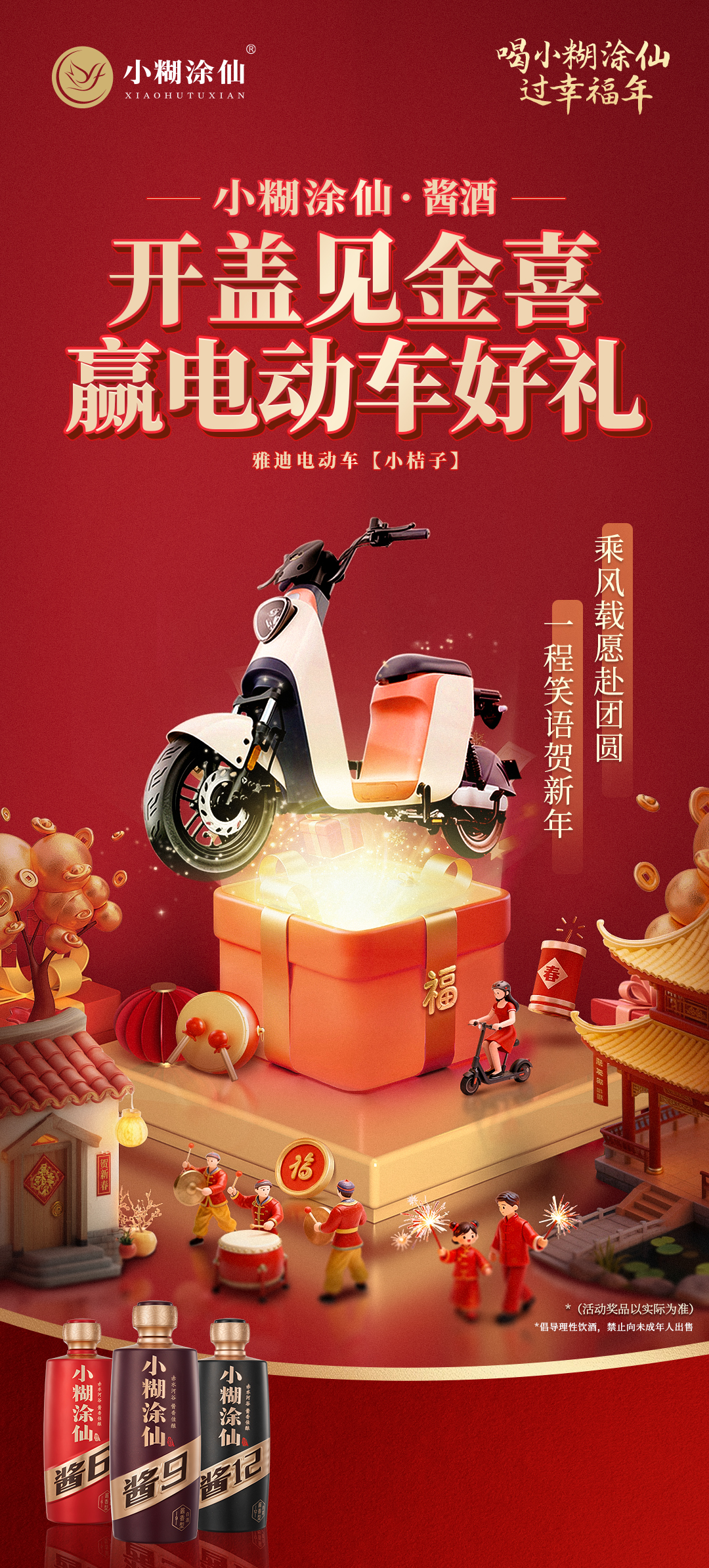 1月15日至3月6日期间,消费者购买指定产品,开盖扫描瓶内二维码,即有机会获得华为Pura 80手机、华为平板、雅迪电动车、2g黄金等丰厚礼品。如此一来,每瓶小糊涂仙都宛如一个“幸运盲盒”,为新春佳节增添更多欢乐与温暖。