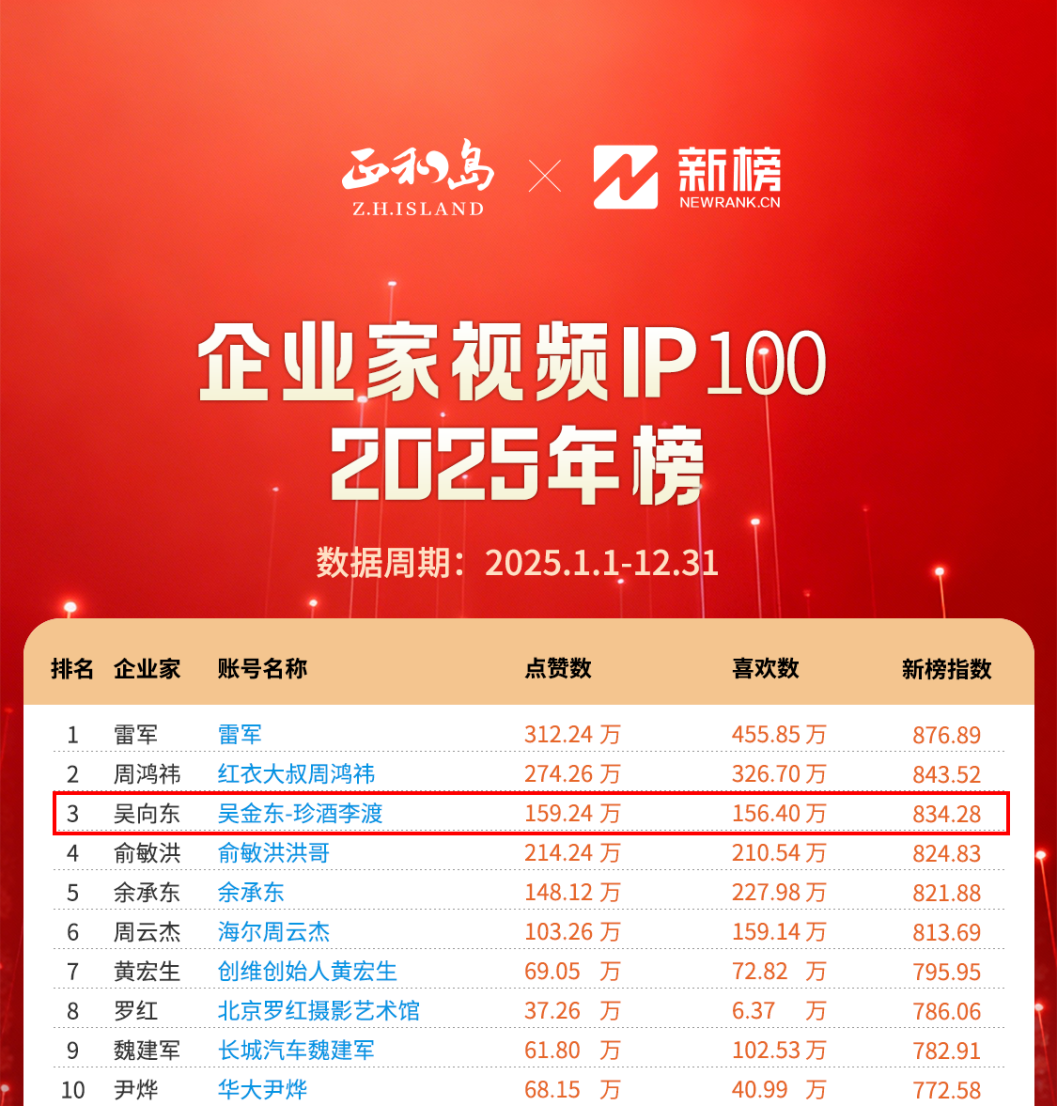 1月22日,正和岛联合新榜发布2025年度《企业家视频IP100榜单》。珍酒李渡集团董事长吴向东视频号“吴金东—珍酒李渡”,凭借广泛关注度和影响力,位列榜单第三。排名前五位的企业家分别是雷军、周鸿祎、吴向东、俞敏洪、余承东。