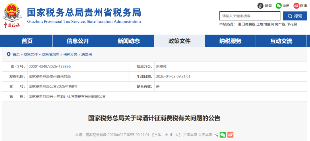 4月2日,国家税务总局发布2026年第8号公告,对啤酒消费税计征标准作出明确规定。 自2026年4月1日起,啤酒生产企业销售的啤酒,应以生产企业出厂价格与关联销售单位对外销售价格孰高者,作为确定消费税单位税额的依据。《国家税务总局关于啤酒计征消费税有关问题的批复》(国税函〔2002〕166号)同时废止。 云酒头条了解到,此前实行的"国税函〔2002〕166号"曾明确,啤酒生产企业销售的啤酒,"应以其关联企业的啤酒销售公司对外的销售价格(含包装物及包装物押金)作为确定消费税税额的标准,并依此确定该啤酒消费税单位税额"。 此次新施行的公告则在关联销售单位对外销售价格之外,同步考量生产企业出厂价格,取二者中高者作为消费税单位税额的依据。 附:国家税务总局关于啤酒计征消费税有关问题的公告(国家税务总局公告2026年第8号) 根据《中华人民共和国消费税暂行条例》及其实施细则,现将啤酒计征消费税有关问题公告如下: 一、啤酒生产企业(以下简称生产企业)销售的啤酒,应当以生产企业出厂价格与关联销售单位对外销售价格孰高者作为确定消费税税额的标准,并依此确定该啤酒消费税单位税额。 二、本公告所称关联销售单位,是指按照《中华人民共和国税收征收管理法实施细则》第五十一条和《国家税务总局关于完善关联申报和同期资料管理有关事项的公告》(2016年第42号)第二条有关规定认定的单位和个人。 三、出厂价格和对外销售价格,是按牌号、规格分别计算的加权平均价格,计算公式为: 出厂价格=生产企业当月销售额/生产企业当月销售数量; 对外销售价格=所有关联销售单位当月对外销售额合计/所有关联销售单位当月对外销售数量合计。 四、本公告自2026年4月1日起施行。《国家税务总局关于啤酒计征消费税有关问题的批复》(国税函〔2002〕166号)同时废止。 附:关于《国家税务总局关于啤酒计征消费税有关问题的公告》的解读 为规范啤酒行业税收征管秩序,税务总局制发本公告,就啤酒计征消费税有关问题进行明确。 一、本公告中的对外销售如何定义? 对外销售,是指关联销售单位将啤酒产品销售给不存在关联关系的单位或者个人的行为。 二、出厂价格和对外销售价格具体如何计算? 出厂价格和对外销售价格,是按牌号、规格分别计算的加权平均价格,举例说明如下: 某啤酒生产企业2026年4月向关联销售单位销售了三批次A款啤酒,销售额分别为120万元、160万元和280万元,销售数量分别为340吨、510吨和850吨,因此A款啤酒的加权平均出厂价格=(120+160+280)/(340+510+850)=3294元/吨。 上述啤酒生产企业的3个关联销售单位2026年4月均对外销售了A款啤酒,销售额分别为100万元、150万元和240万元,销售数量分别为385吨、580吨和880吨,因此A款啤酒的加权平均对外销售价格=(100+150+240)/(385+580+880)=2656元/吨。 按照本公告第一条的规定,啤酒生产企业销售的啤酒,应当以生产企业出厂价格与关联销售单位对外销售价格孰高者作为确定消费税税额的标准,并依此确定该啤酒消费税单位税额。由于A款啤酒的出厂价格大于对外销售价格,因此应以出厂价格(3294元/吨)作为确定消费税税额的标准,需按甲类啤酒(3000元/吨以上)征收消费税,单位税额为250元/吨。