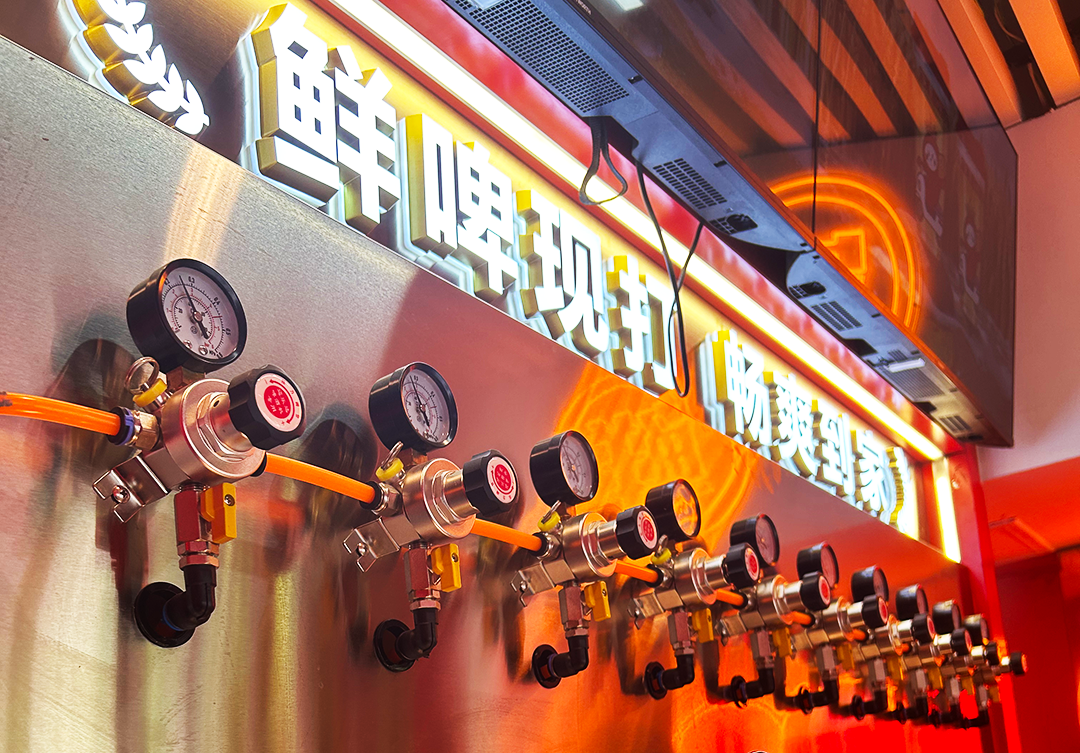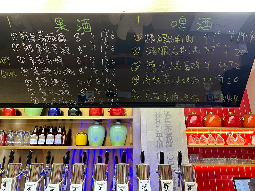玉林东路至玉林西路短短几百米,一条街布满了各式新型打酒铺:唐三两打酒铺、川酒e店、鲜啤福鹿家、皮浪精酿……放眼望去,一排排金属打酒头排列得整整齐齐。很多年轻人没有“坐在小酒馆的门口”,而是点单打酒、扫码付款、打包拎走,动作流程如同买一杯奶茶。