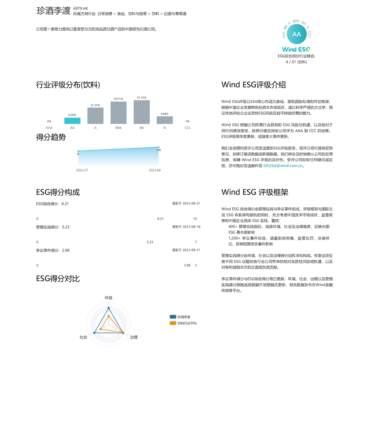 作为ESG深度践行者, 作为高成长型企业的珍酒李渡, 不断为利益相关者和社会创造更大价值。 近期,随着首届中国酒业ESG论坛的成功举办,ESG一词在酒业的关注热度再次走高。 论坛上发布的《中国酒业ESG发展报告(2022)》显示,中国酒业2022年用于环境治理的总资金投入达到15.12亿元,酒企们通过组织行业环保宣传系列活动,年度触达消费者9000万人次。 这无疑彰显了酒类企业在自身发展过程中所具备的担当和责任意识。 作为ESG的深度践行者,“港股白酒第一股”珍酒李渡,通过长期的创新和实践,已经成为白酒行业绿色发展的标杆企业。珍酒李渡在ESG方面取得的各项重要成绩,也成为企业综合实力和良好形象的重要组成部分。 █ 一系列持续性动作,折射企业绿色发展理念 日前,珍酒李渡集团旗下核心企业和旗舰品牌贵州珍酒发布了一款ESG环保礼盒,引发广泛关注。该礼盒通过回收做工精美但使用后即被丢弃的酒瓶,匠心设计并改造成文创茶具,让旧酒瓶成为新礼盒,被业内人士评价为“以创新之举践行绿色发展理念”。 ▎贵州珍酒ESG环保礼盒 云酒头条注意到,这款ESG环保礼盒的包装以山脉地形的层叠美为灵感,通过巧妙的设计和工艺,将大自然的壮丽山峦融入包装之中,并选用环保包装材料进行制作,兼具实用性和艺术性。 据了解,为了保障回收酒瓶的安全与品质,珍酒建立了严格的酒瓶回收、筛选、再加工、质检等标准和程序,并针对每次酒瓶回收设立台账,确保每一个酒瓶都能实现真回收和可溯源。 可以说,一个小小的ESG环保礼盒,巧妙地传达了珍酒始终关注绿色发展的ESG理念。而这,只是珍酒深刻践行ESG的一个切面。 11月8日,工业和信息化部发布的《2023年度绿色制造名单》公示名单中,贵州珍酒也作为仅有的四家白酒企业之一赫然在列,另三家分别为贵州茅台、山西汾酒、江苏今世缘。 11月10日,中华全国工商业联合会发布的2023中国民营企业社会责任优秀案例名单中,贵州珍酒同样在列,一同上榜的还有京东、蚂蚁科技等。 ▎珍酒李渡获万得ESG“AA”评级 12月3日,在此前已获得国内权威ESG评级机构——万得(Wind)ESG“AA”评级的基础上,珍酒李渡更是在7500余家上市公司中脱颖而出,上市首年即获评“Wind中国上市公司ESG最佳实践100强”。珍酒李渡凭借ESG卓越表现,成为榜单中唯一入选的白酒企业,也反映了投资市场和评级机构对珍酒李渡高质量发展的肯定。 ▎国宝李渡助力“鄱阳湖国际观鸟季” 12月10日,国宝李渡亮相第三届鄱阳湖国际观鸟季,举办生态李渡摄影展,设立“国宝李渡公益观鸟点”,并以宋徽宗所作《瑞鹤图》为灵感推出公益限定瑞鹤酒,积极践行ESG发展理念,以实际行动守护“国宝”白鹤、推进绿色发展。 12月15日,在人民日报主办的2023中国品牌论坛上,珍酒李渡同五粮液、百度、海尔、伊利等知名企业一起获得“2023年度中国品牌创新案例”荣誉称号。“承担社会责任,构建六大ESG体系,聚焦共享发展,推动各方互利共赢。夯实高质量发展底座,赋能可持续发展。”2023中国品牌论坛在给珍酒李渡的颁奖词中评价道。 可以看到,仅11月以来,珍酒李渡在ESG方面取得的成绩已被广泛认可。 █ 高度重视+长期践行,不断完善六大ESG社会责任体系 在珍酒李渡屡获ESG殊荣的背后,离不开企业对ESG的高度重视和长期践行。珍酒李渡围绕乡村振兴、绿色发展、理性饮酒、社会公益、产区建设、价值共享已建立六大ESG社会责任体系。 乡村振兴方面,珍酒李渡基于白酒产业带动一、二、三产业的特性及多品牌、多品类、多地域的优势,带动当地种植有机高粱、小麦、水稻等农作物50万亩,促进十余万农村家庭增收。 ▎湘窖酒厂外景 绿色发展方面,从打造绿色化原料种植基地,到推动包材绿色环保化;从推动清洁能源转型,到借助数字化技术降低能耗;从推出环保而极简的高端光瓶酒系列产品,到此次发布ESG环保礼盒促进酒瓶回收,珍酒李渡一直在绿色发展方面进行着创新和实践。 理性饮酒方面,珍酒李渡始终以“承诺+行动”倡导“少喝酒、喝好酒”的理性饮酒理念。近期中国酒业协会主办的理性饮酒宣传周门店活动,珍酒李渡集团旗下企业均有参加,近50家门店集中悬挂宣传条幅、张贴海报、摆放台卡、播放视频、向客户分发相关宣传材料等。珍酒李渡在为消费者提供高品质酒类产品的同时,积极推动理性饮酒成为社会共识。 ▎“湘窖·我的大学梦”大型公益助学爱心基金 社会公益方面,珍酒李渡以行业支持、地区建设、慈善救济、教育事业、环境保护等为重点支持领域,每年开展多项公益支持活动,并向中华慈善总会、湖南省青少年发展基金会、江西省李渡教育基金会捐赠善款。截至2023年,“湘窖·我的大学梦”大型公益助学爱心基金已经累计资助超6480名优秀寒门学子,累计捐款超过3340万元。 产区建设方面,珍酒李渡呼吁中国酱酒核心产区学习借鉴法国波尔多等世界优秀产区,就产区声誉保护制定负面清单,打造世界级的伟大产区。 ▎珍酒·珍三十 价值共享方面,珍酒李渡致力于开创兼顾经销商、供应商、消费者、投资者和员工等各方利益的新格局,打造新的价值共同体、利益共同体、命运共同体。 什么样的企业是真正有生命力、受人尊敬的企业?我们发现,那些百年企业,在发展的过程中并不仅仅创造可观的营收,更在于对社会发展能够带来巨大的积极