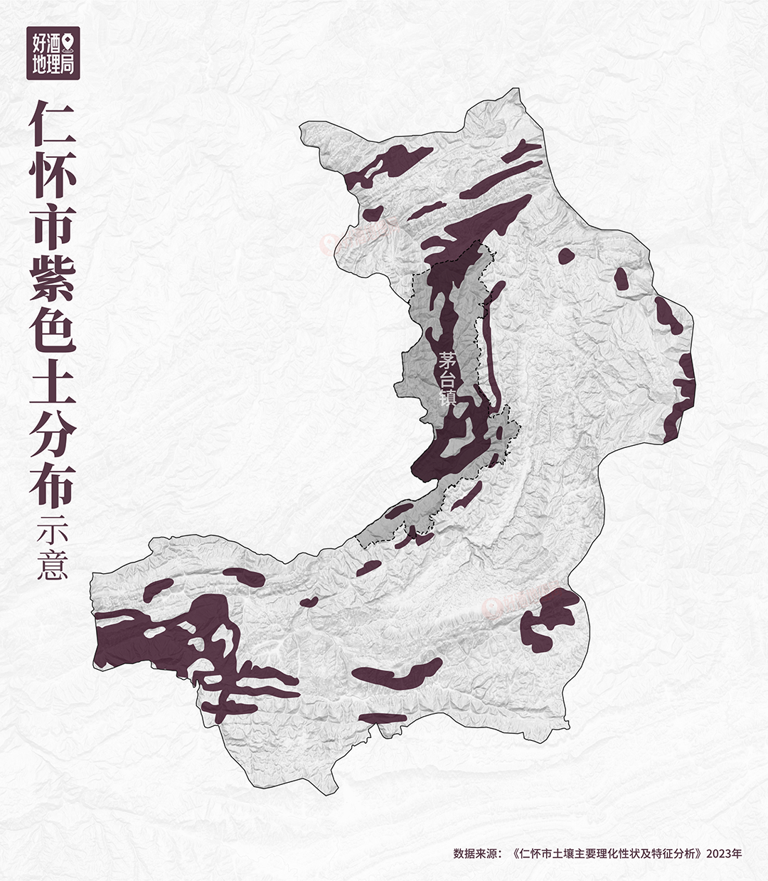 仁怀市的自然土壤理化研究数据显示,其境域内紫色土占比为12.9%,集中分布于茅台镇及其以下的赤水河谷地带。