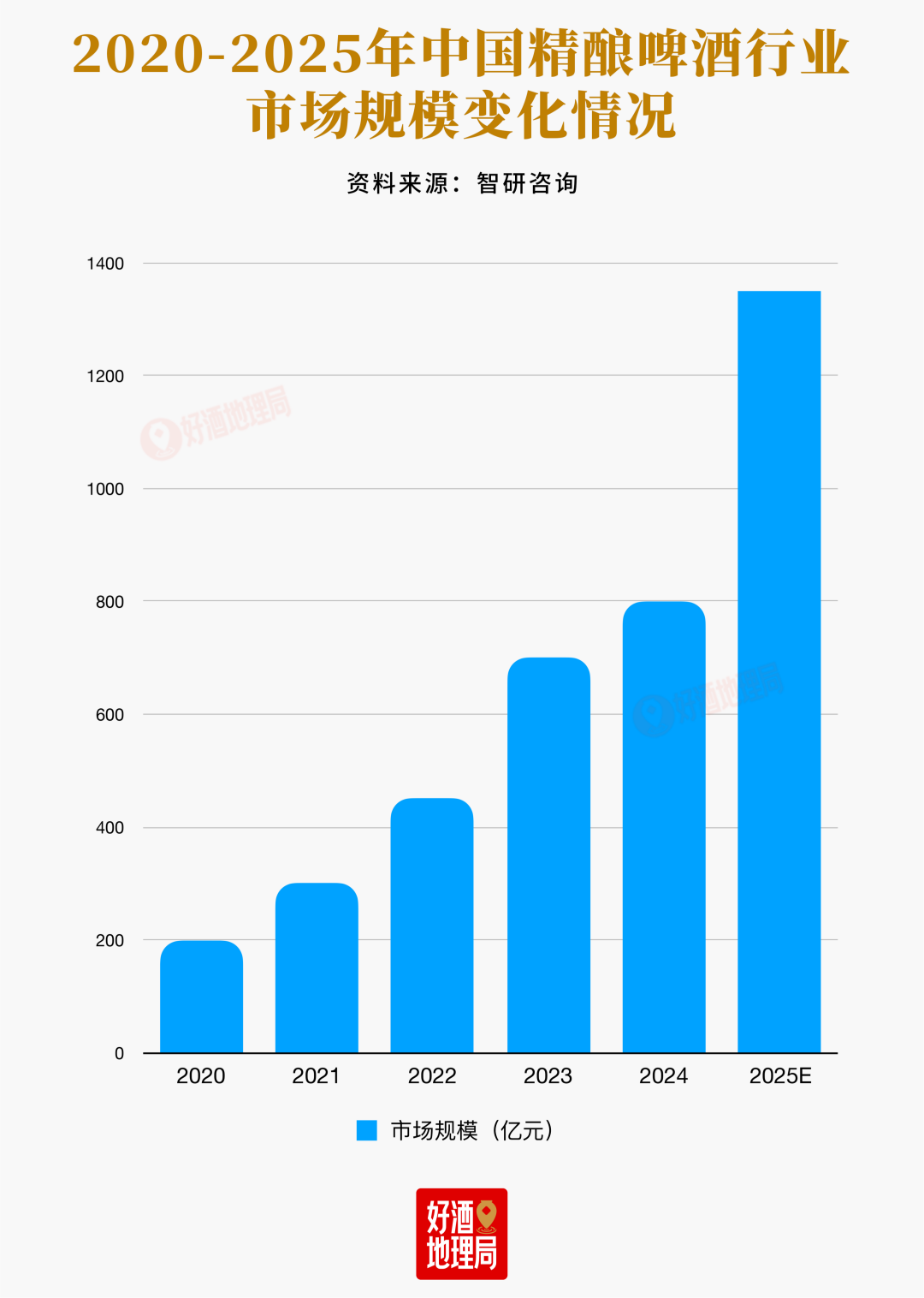 智研咨询数据显示,中国精酿啤酒市场规模已从2020年的200亿元快速增长至2024年的800亿元,年复合增长率为41.42%,预计2025年中国精酿啤酒行业市场规模将增长至1342亿元。