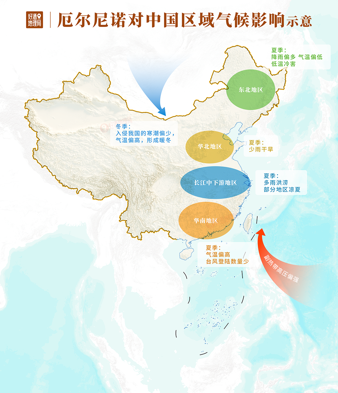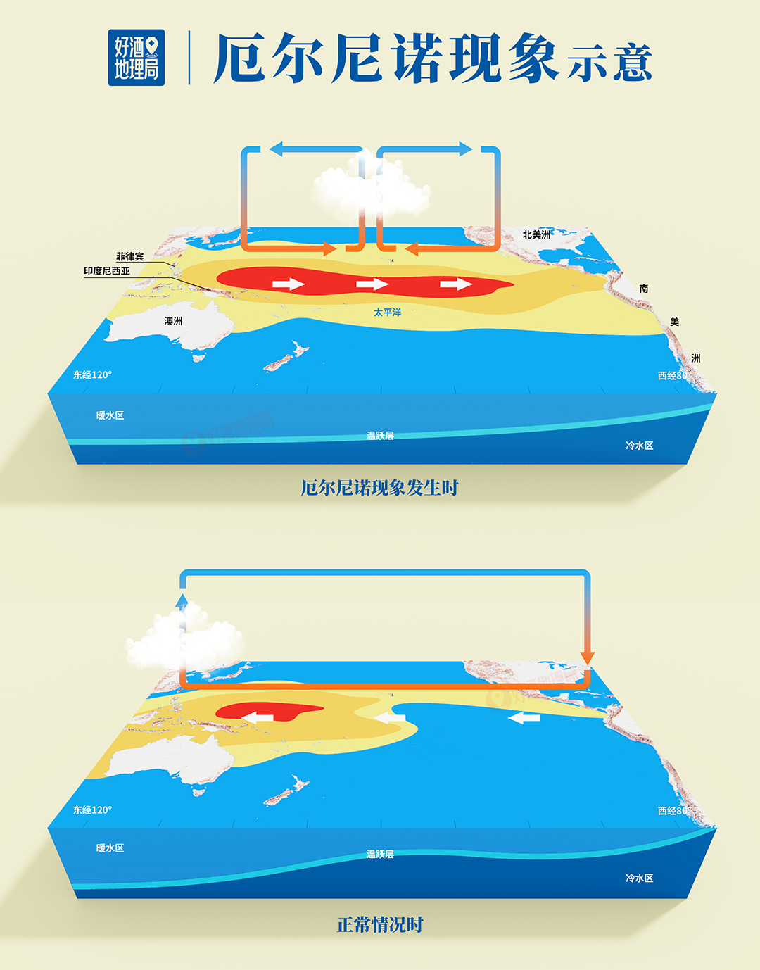 简单来说,在正常情况下,赤道太平洋东部海水温度较低,西部温度较高。但当厄尔尼诺发生时,东太平洋海水异常升温,就像给大气“加热”,常常导致全球一些地区干旱、另一些地区洪涝。