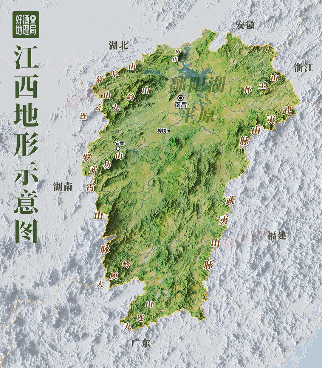 江西全省,东、南、西三面的山地、丘陵,庇佑着约38760.6平方公里的鄱阳湖平原。赣江水系自南向北贯通大半个江西,于省份北部注入鄱阳湖。