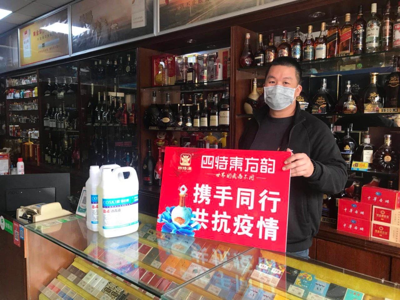 而四特酒一线营销人员所到之处,印有“四特酒公益共抗疫情中国加油”“众志成城抗击疫情——四特酒有限公司”“四特酒向奋战在疫情防控一线工作人员致敬”的大红色条幅也随之高悬。
