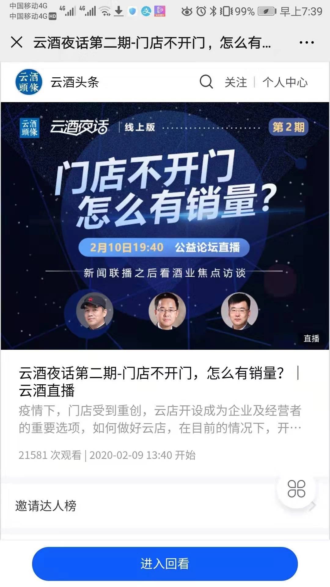 此前,于2月7日举办的第一期云酒夜话公益论坛反响热烈。当众多厂商朋友们提出,想继续了解促动销的干货时,便衍生出了此次云酒夜话的话题,吸引酒类厂商及从业者超两万人在线观看。