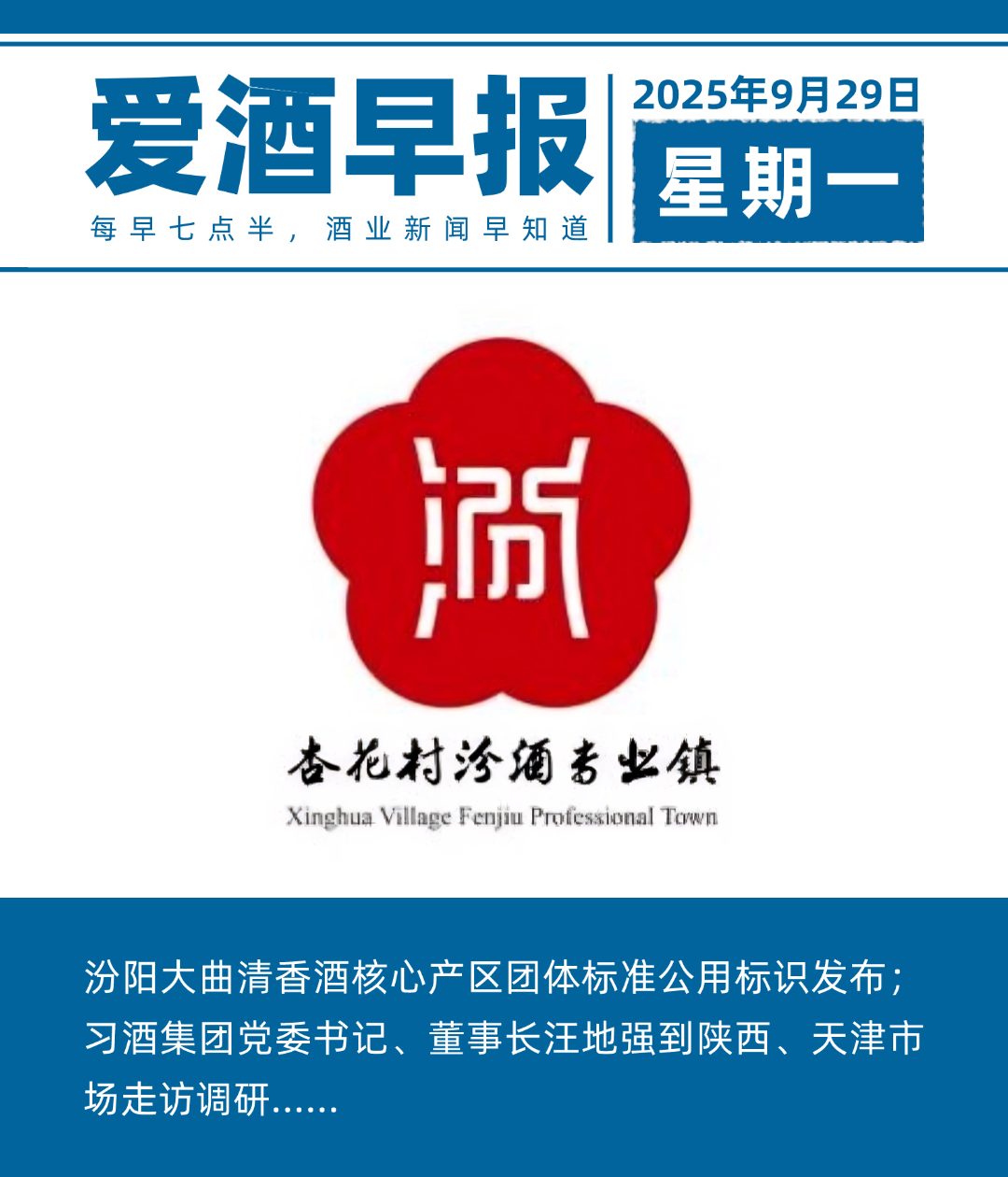 爱酒早报:汾阳大曲清香酒核心产区团体标准公用标识发布;汪地强调研陕西、天津市场