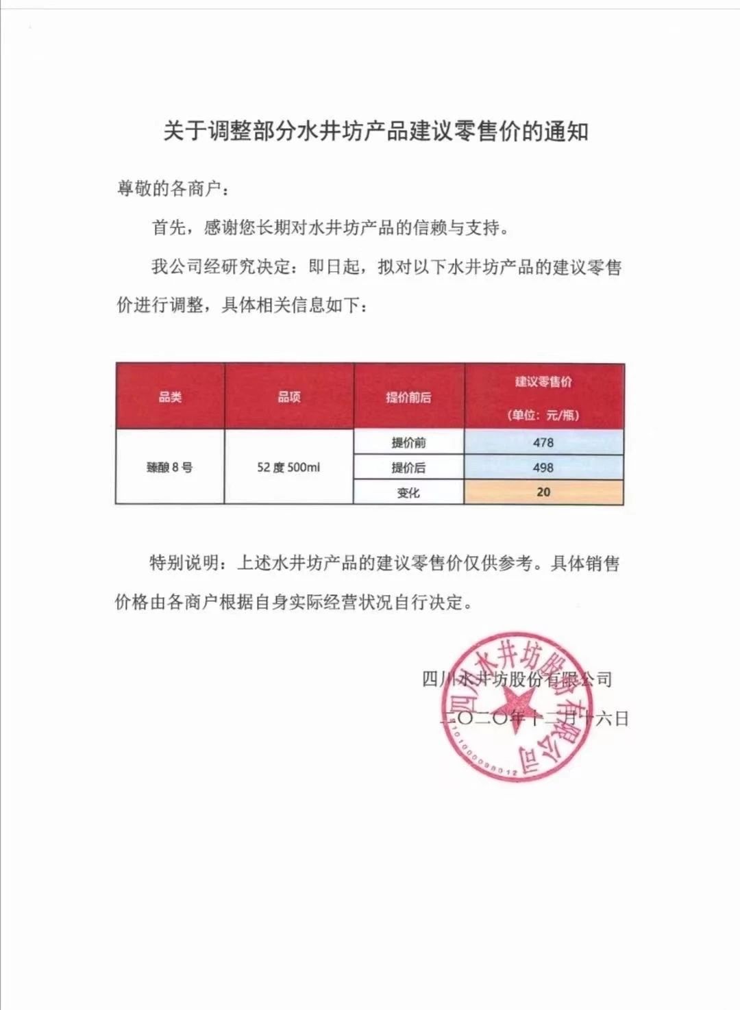 全国酿酒产业前11月产量数据出炉 12月16日,中国酒业协会发布全国酿酒产业1-11月产量数据。11月,全国酿酒产业规模以上企业酿酒产量340.19万千升,同比下降4.45%;1-11月,全国酿酒产业规模以上企业酿酒产量4953.23万千升,同比下降2.53%。具体情况如下表: 商务部回应澳方就征收大麦关税提起诉讼问题 12月17日,商务部召开例行新闻发布会,商务部办公厅副主任、新闻发言人高峰就澳方针对中国对澳大麦征收关税问题向世贸组织提起诉讼表示,中方已经收到该磋商请求,根据中国国内业界申请,中国商务部对原产于澳大利亚的进口大麦依法发起反倾销、反补贴调查,并依法采取相应贸易救济措施。中方一贯以符合世贸组织规则的方式开展贸易救济,并对澳方提出磋商请求表示遗憾,将根据世贸组织争端解决程序进行处理。 五粮液举行第二十四届酒圣祭祀大典 12月17日,2020中国国际名酒博览会·五粮液第二十四届酒圣祭祀大典在酒圣山举行。本届大典以“祭工匠精神”“祭历代传人”“祭酿酒历史”为核心,通过盛世礼炮、乐舞告祭、净手焚香、尊请圣物、三献礼等环节,展现五粮液对极致品质的追求,寓意并激励五粮液人始终不忘初心、坚守匠心。 四川省食品烟酒类价格同比上涨12.1% 四川日报12月16日报道,四川省统计局数据显示,1-11月,全省规模以上工业增加值同比增长4.0%,增速比1-10月回升0.3个百分点。其中,1-11月,食品烟酒类价格同比上涨12.1%。11月,CPI同比下降0.8%。 《烟台葡萄酒产区保护条例》发布 12月14日,烟台市市场监管局公布《烟台葡萄酒产区保护条例》。《条例》规定,烟台葡萄酒产区保护规划应当包括产区的保护与发展、酿酒葡萄种植区划定、公共基础设施配套建设、生态保护措施、品牌保护等内容;建立健全葡萄酒安全追溯体系,确保烟台葡萄酒品质,建立记录原料采购、加工、销售的相关纸质档案或者电子档案,档案保存期限不得少于葡萄酒保质期满后六个月,没有明确保质期的,档案保存期限不得少于十年。《条例》自2021年1月1日起施行。 老乡鸡华南首店试营业,增设酒吧等场景 近日,老乡鸡华南首店试营业,店铺面积约280㎡,实行全时段经营,从早上10点营业到凌晨2点,提供包括早餐、下午茶、晚餐、酒吧等场景,17:30后,店内开始提供酒水,包括啤酒、鸡尾酒、威士忌、特调等。 水井坊臻酿8号涨价 12月16日,水井坊发布通知,公司经研究决定,拟对臻酿8号52度500ml进行提价,提价前为478元/瓶,提价后为498元/瓶,上涨20元。具体情况如下图所示。 张裕1347万瓶葡萄酒溯源信息已上链 经济观察网12月16日报道,张裕&腾讯区块链合作项目一期工程已基本完成,实现了产品溯源、防伪、与消费者沟通营销平台的连接打通、第三方验证等功能。据内部统计,截止11月30日,已有超过1347万瓶葡萄酒的溯源信息上链。 根据项目规划,接下来,张裕将联合各葡萄酒主产区监管部门,将其出具的监管信息上链,实现政府及权威机构对葡萄酒产品质量、安全的穿透式监管与服务,同时依托监管机构的权威背书,提升整个溯源生态的公信力。此外,张裕还计划2022年上半年末,引入山东省内十家以上葡萄酒厂家及进口商参与到该项目中,让区块链技术应用为山东葡萄酒行业赋能。 长城葡萄酒将扩大种植规模 12月16日,2021年中粮长城葡萄酒经销商大会在武汉举行。会上,中粮酒业总经理助理周鹏表示,2021年,长城葡萄酒计划在主要酿酒葡萄产区继续扩大种植规模,优化种植结构。 全国酿酒产业1-11月产量数据出炉,你怎么看?文末留言等你分享!